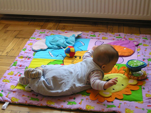 Úgy éreztem itt az idő, hogy teret adjak Levinek, hogy ne csak a kiságyban és a kanapén mozogjon. Előszedtem az Egértől kapott bejáratott habtapikat, és alapos lemosás után összerakva átadtam Levinek az új játszóterét. Az első percekben a sok színes forma teljesen lekötötte, majd eljött az igazi tesztelés, a jól megszokott repülőzés. Ahogy elnézem teljesen mindegy mekkora területre teszem le a habtapit, valahogy mindig addig izeg-mozog vagy forog hogy már lelóg a lába a parkettára vagy érdeklődve tapogatja a kezével a habtapi szélét. Megfordulni nem nagyon akar, az oldalára is ritkán fordul, inkább forog a tengelye körül vagy hátrafelé tolat és amint hasra kerül repülőzik fáradhatatlanul.