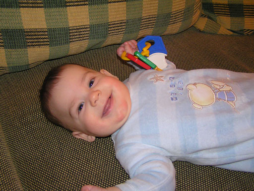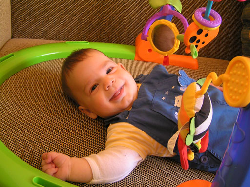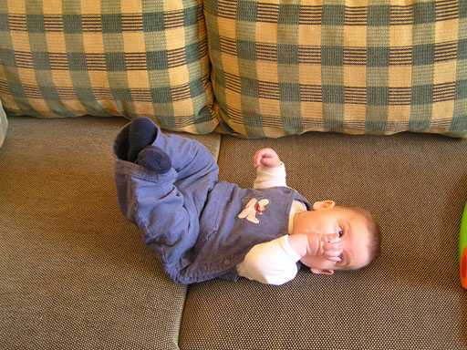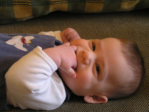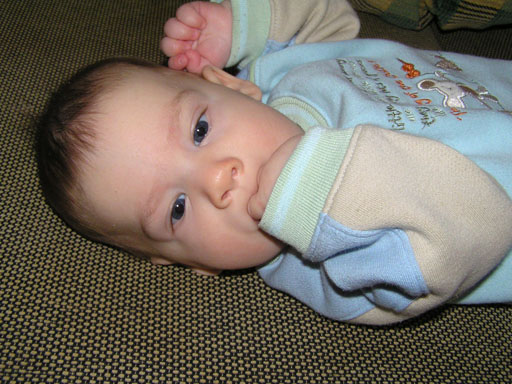 Lábemelgetésben már profi. Emelgeti, ha játszom vele vagy amikor jókedve van és persze közben szopogatja és rágcsálja valamelyik ujját a sok közül.