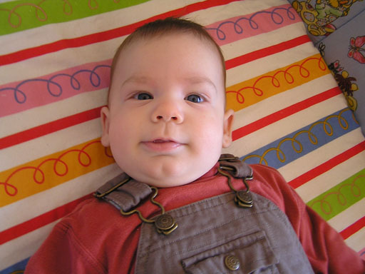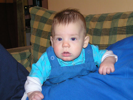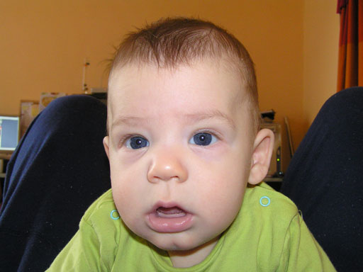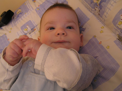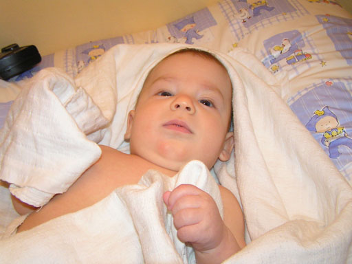 A nagy játékban elfáradva nagyot szundít délután és általában mire Andris megjön addigra szokott felébredni. Ekkor jön a férfiak beszélgetése az élet nagy kérdéseiről és néha ha megengedik, akkor én is csatlakozom hozzájuk. Este 9 órakor következik a fürdés Apával, én ilyenkor csak asszisztálok, és persze az én dolgom a vetkőztetés, a fürdés utáni törülközés és éjszakai hálóruci felöltése. Ilyenkor már elég fáradt, amint leteszem pár perc méltatlankodás után már alszik is. Az éjszakát is nagyjából végigalussza már, hajnali 5 óra körül van már csak egy etetés, aztán alszik tovább reggelig. Persze egy kisbabánál egy állandó dolog van a változás, ezért általában minden változik, van hogy annyira kifárad, hogy hajnalban fel se kell és alszik reggelig. De olyan is van, hogy reggelig még kétszer ébreszt fel, hogy éhes. A képen éppen alvás után próbál magához térni, azért ez bamba tekintet.