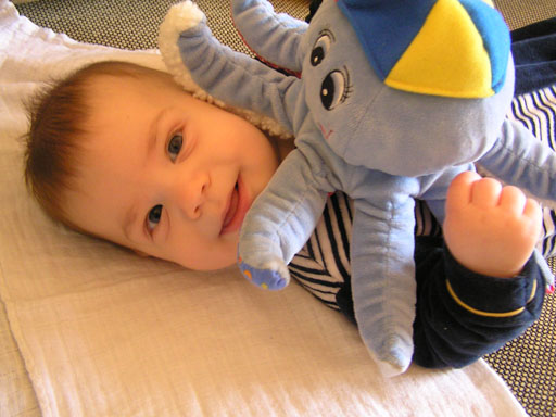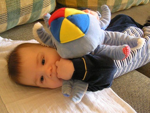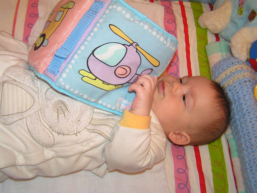 Doktornénink mikor az oltást kaptuk hétfőn kérdezte, hogy oldalra fordul-e már a gyerkőc. Mondtam, hogy még nem. Erre vasárnap reggel rácáfolt a gyermek, megmutatta, hogy tud Ő már ha akar az oldalára fordulni, csak nem akar. Most sokkal jobban érdekli, hogy milyen magasra tudja emelni a két lábát egyszerre, mióta rájött, hogy a lábait is tudja irányítani. Már most látszik, hogy örökölte tőlem a könyvek szeretetét, imádja ezt a zörgős textilkönyvet, elmélyülten forgatja és persze rágcsálja ahol éri.
