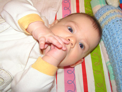 Csodálatos ahogy kezdi felfedezni maga körül a világot, tudatára ébred saját testének és képességeinek. Csak kapkodom a fejemet és ámulok, hogy fejlődik napról napra. A héten rájött, hogy két keze van, nem csak egy. Azóta elmélyülten tördeli az ujjait, tapogatja és simogatja egyik kezével a másikat. Nagyon mókás, ahogy imára kulcsolja össze a két kezét, és persze megpróbálja mindkét kezét egyszerre betömni a szájába .