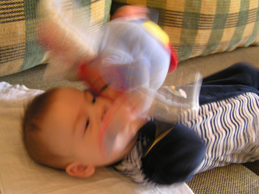 Az evés még mindig szent dolog, ha nincs azonnal kaja amikor ráeszmél, hogy éhes, akkor jön a sírás, ami hála jól fejlett tüdejének egyre erőteljesebb. Amilyen hisztit levág, ha nincs rögtön kaja, ahhoz képest nem csinál nagy ügyet az evésből 5-10 perc alatt lezavarja. Az első percekben néma áhítattal eszik, ilyenkor a keze is mozdulatlan. Majd ahogy telítődik a poci egyre izgágább lesz. Rúgkapál, mocorog, a szabadon lévő kezével a pólómat markolássza, a fejét pacskolja, kapirgálja a fejbőrét, tépegeti a fülét, és persze közben folyamatosan vigyorog rám és dünnyög az orra alatt, ahelyett, hogy rendes csecsemő módjára táplálkozna. Aztán egy gyors büfi vagy kettő és mehet megint a játék vagy az alvás.