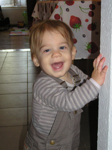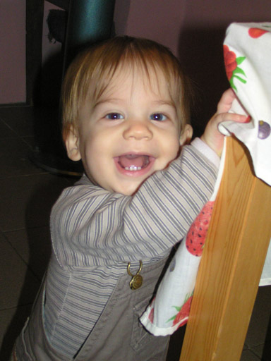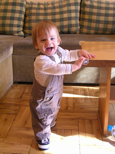 Már nagyon profin jár-kel a lakásban lábon, kitipeg az ebédlőbe is. Vagy egy széket tol maga előtt lépés segítőként vagy a falak mellett kapaszkodva jut el az ebédlő asztalig, itt éppen a asztal lábába kapaszkodik vidáman.