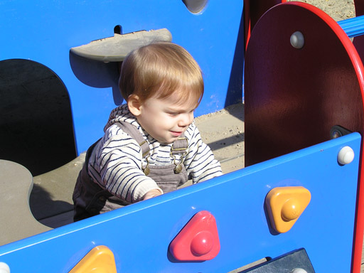 Mikor megunta a hintázást, kipróbáltuk ezt az univerzális autónak álcázott mászókát. Vigyázó szemeim előtt ücsörgött rajta, majd mikor elunta az ücsörgést kipróbálta a tekerhető kormányt elől, hátul a platón meg forgatta a sárga és piros háromszögeket. Mikor kezdett elfáradni betettem a kocsiba és mivel sem a 105-ös se a 120-as busz nem volt alacsony padlós (csókoltatom a BKV-t ezúton is) így elsétáltunk a villamosig, én elfáradtam Levi meg elaludt mire hazaértünk.