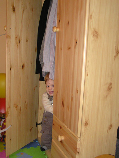 Szuper hely a szekrény belseje is, ide be is lehet bújni Apa ingei alá és innen vigyorogni Anyára. Néha megpróbálja lerángatni az ingeket a vállfáról, de ezt nem szoktam hagyni, elég volt minden inget egyszer kivasalni.