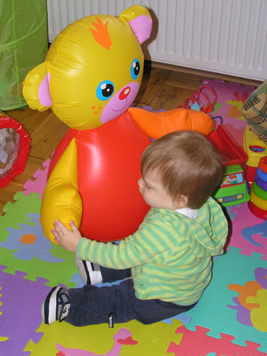 Néha elkapja a macit egy körre, püföli és ráncigálja, de leginkább a maci felfújókája érdekli, azt piszkálja.