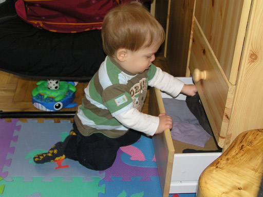 A lakás kész kalandpark Levinek, csupa izgalmas eddig el nem ért vagy fel nem fedezett bútorral. Már ki tudja húzni a nagy szekrény fiókjait is, és nagy örömömre ügyesen kidobálja belőle Andris alsógatyáit és zoknijait. Próbálom rábeszélni, hogy utána pakolja is vissza, de ez még nem akaródzik neki. A fiók betolásának technikája még nem tökéletes, néha odacsípi 1-1 ujját ilyenkor nagy sírás van, de aztán gyorsan megbékél és tovább pakolja ki a fiók tartalmát.