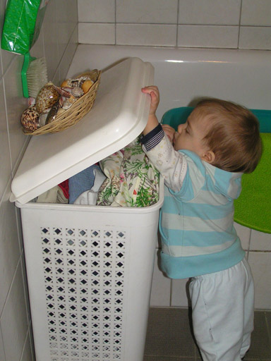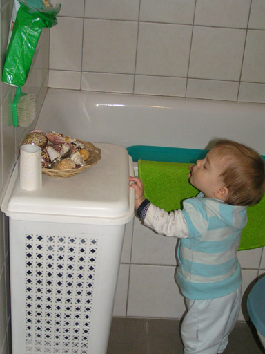 Már bejáratos a fürdőszobába is, néha ha nem vagyok elég elővigyázatos és véletlenül nem zárom kilincsre az ajtót, profin kinyitja azt és bemászik. Nagyon kíváncsi, semmi nem kerüli el a figyelmét, kinyitja a mosdó alatti kis szekrényt, kicsit csapkodja az ajtaját, aztán belenéz a szennyes tartóba is, ha hagynám talán ki is pakolná belőle a cuccokat. Miután szemrevételezte és rájön, hogy semmi érdekes nincs benne, kipróbálja milyen amikor lecsapja a tetejét, ezt párszor megteszi mivel tetszik neki a pufogó hang. Persze a csapkodás hatására a tetején lévő kosárban kánkánt jár az összes kagyló és csiga. Ez sokkal érdekesebb, mint a csapkodás, így témát vált és próbálja megkaparintani őket, ha sikerült a művelet; először megrágcsálja majd teszteli mennyire törékenyek és lelkesen dobálja le őket a kőre. Másik nagy kedvence a WC papír, ha eléri rögtön megcsócsálja (sose fogom megérteni mi a jó a papír ízében:) és ha marad még belőle valamennyi azt ügyesen letekeri a gurigáról. Aztán mit aki jól végezte dolgát ül a káosz közepén, körülötte csigák, kagylók és a letekert klotyópapír és persze csak kacarászik mikor leszidom és próbálom eltakarítani a csatateret.