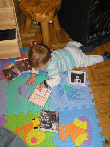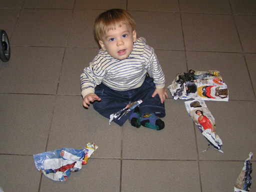 Levi imádja a papír minden formáját, a könyveket előszeretettel rágcsálja meg, így azt csak szülői felügyelet mellett olvashat. A WC papírról már meséltem és persze nem szabad kihagyni a mindenféle reklám újságokat sem. Ezekkel aztán lehet garázdálkodni, ki is használja a lehetőséget, széttépi őket kis darabokra, aztán megpróbálja meg is kóstolni, de ezt már nem engedem nagy bánatára. A képen éppen egy reklám újságot olvas ki.