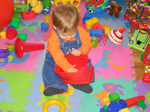 Lassan megtanulja, hogy a tárgyakat nem csak kidobálni lehet, hanem be is lehet pakolni őket egy nagyobb tárgyba. Persze azért kidobálni azért sokkal viccesebb dolog még mindig. De néha már bele is pakol a piros vödörbe, igaz nem a formákat szokta, hanem ami éppen a keze ügyébe kerül, ha nem fér bele akkor dühös és mérgesen próbálkozik, hátha csoda történik és mégis belefér. Amúgy nagy pakoló művész, mindenhonnan elveszi a tárgyakat; az ebédlőben a polcról, az asztalról a szobában, a székről. Ha nem vagyunk elég szemfülesek és nem figyelünk rá, minden megragad és már menekül is a zsákmánnyal; legyen az egy darab papír, távirányító, telefon, könyv vagy ásványvizes palack vagy bármi ami tiltott dolog és nem szabad.