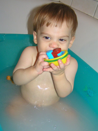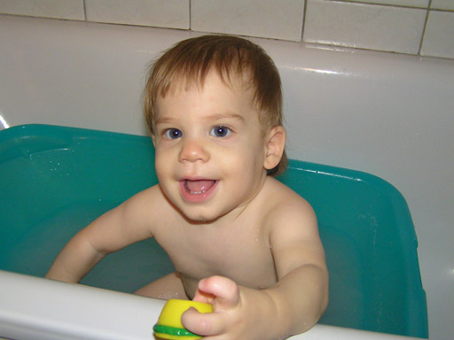 Mostanában már leszoktunk a babás fürdésről, ami úgy nézett ki, hogy a mosógépre tettük a babakádat és abba fürdettük. Ez már nem működik, mert Levi akkora pancsoló művész, hogy utána úszik az egész fürdőszoba, meg mi is csurom vizesek lettünk. Így jött a nagy ötlet, kis kádat a nagy kádba és abba a gyereket. Azért nem a nagy kádban fürdik, mert még mindig nem vettem bele csúszásgátló szőnyeget és anélkül nem túl biztonságos, szegény mindig megcsúszott benne. Így egyelőre a kis kádban lubickol a nagy kádban, amit nagyon élvez, pancsol, csapkodja a vizet és a fürdőszoba is kevésbé lesz vizes, bár a kád körül azért így is minden csupa víz. A fürdés másik főszereplője a zuhanyrózsa, Levit teljesen megbabonázza, ahogy jön belőle a víz. Csapkodja a vékony vízsugarakat, próbálja megfogni őket és közben kacag és fülig ér a szája. A vége főcím előtt még jön egy totális csapkodós szám, ilyenkor még a füléről is csorog a víz, de nem zavarja. Néha a nagy csapkodásban sikerül a szájába is vizet fröcskölni, ilyenkor meglepődik egy kicsit, de aztán megy tovább a csapkodás és pancsolás.