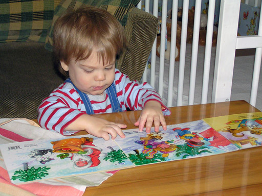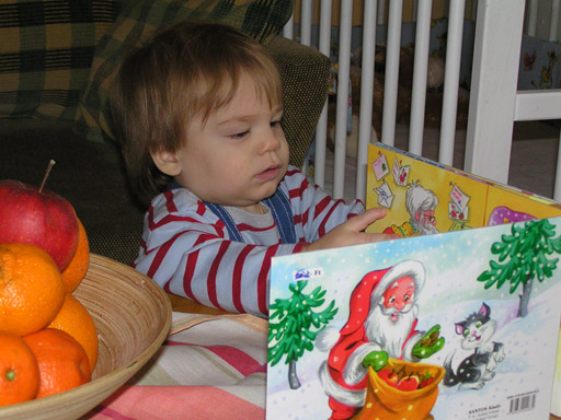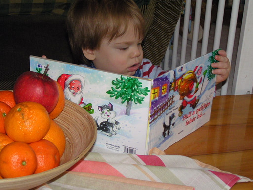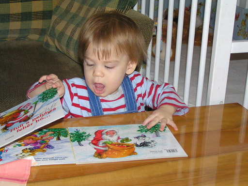 Most már nagyon ügyesen tudja lapozni a leporelló mesekönyveket is, ez a Hull a pelyhes... -t Zsoltéktól kapta ajándékba. Rájött, hogy ez máshogy nyílik, nem egy irányba, mint a másik kemény lapos karácsonyos mesekönyv, amit az Erikától kapott.