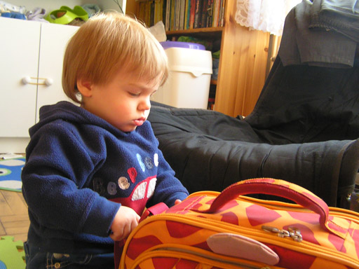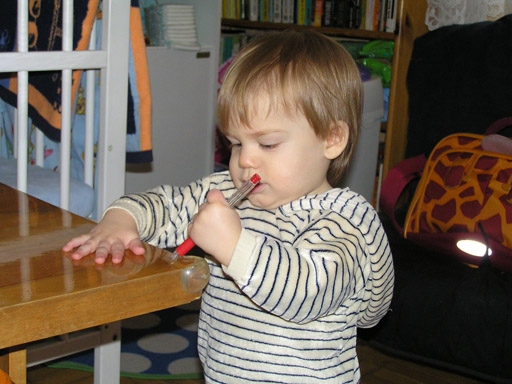 A másik nagy kedvenc egy vékonyan fogó filctoll, ami már nem ír, így oda mertem adni neki, mert nem tud vele firkálni. Ezt ha az ölembe ül a gép előtt mindig elkéri, a tolltartóból; nyújtja érte a kezét, hogy adjam oda neki. Rájött, hogy le lehet szedni a kupakját, sőt tegnap ki is belezte, úgyhogy így aztán totál gyerekbarát lett a toll, hogy csak a külső műanyag borítása van meg. Bár teljesen jól eljátszik bármivel ami útjába akad, legyen az a pelenkázótáska cipzára vagy egy gördeszkás kutyus, amit tologathat az asztalon vagy a habtapin egy hangszer rázogatása.