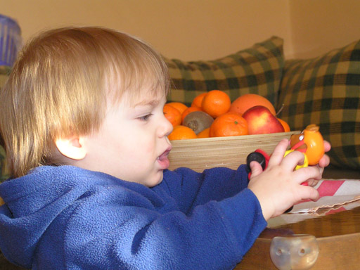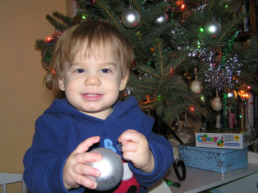 A hét kedvencei a hűtőmágnesek, egy párat megkapott Levi amit az alsó mélyhűtőre tettem, a többi értékesebbet pedig felpakoltam a hűtőre így nem éri el őket. Most már nagyon ügyesen le tudja őket szedni, néha csak tologatja fel-le őket a hűtőn tetszik neki, hogy ott maradnak, nem esnek le. Az ünnepek alatt persze a karácsonyfa is központi helyen volt, néha felvettem a karomba és jó pár percig szemlélte testközelből a fát és rajta a díszeket, mutatta is hogy melyiket szeretné, ha levenném neki. Ez a műanyag ezüst színű gömb volt a kedvenc, az akasztóján volt egy ezüst cérna amivel nagyon tetszett Levinek.