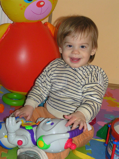 Ma nagy nap virradt ránk, mióta megszületett Levi Andrissal először mentünk el kettesben moziba, addig Levire anyósom és Andris öccse, Tibi vigyázott. Persze mielőtt elmentünk a moziba elköszöntünk Levitől, meg mondtam anyósomnak, hogy lehet hogy sírni fog majd egy picit. De egyáltalán nem sírt, egyből otthon érezte magát és nem búsult utánunk (zokon is vettem, hogy fel se tűnt neki, hogy elmentek a szülei:). Jól érezte magát; játszott a Mamával és a Tibivel meg az új labdájával, amit Kati mamától kapott. Persze nem csak játszottak, megnézték Pepita kutyát a kertben, az órát a falon (Levi teljesen beleszeretett az órákba pár napja és ha olyan kedve van mondja is hogy tik-tak). Legjobban a zenélő rénszarvas tetszett neki, lelkesen nyomogatta, hogy énekeljen, aztán mikor megunta, felfedezte magának a szobát is, mindent körbejárt, megtapizott és amit hagytak neki, azt el is mozdította. Aztán szófogadó kisfiúként majdnem mind megette a bekészített zöldséges-husis rizst, amit itthonról vittünk neki, anyósom csak ámult mennyit eszik a gyerek. Eddig is mondtam én, hogy haspók a drágám, csak míg nem látja senki nem hiszi el mennyi fér a pocakjába. Aztán a nagy evésben és játékban kifáradt és délután elszundított a Tibi vállán. Miután felébredt evett egy kis gyümölcsöt, aztán közben megérkeztünk mi is. Még együtt megvacsiztunk - persze Levi itt is kunyerált, hiába volt tele a pocakja - és jöttünk haza, mert a sok élménytől már nagyon elfáradt, meg késő is volt. Miután ágyba dugtam aludt, mint egy kis angyal reggelig.