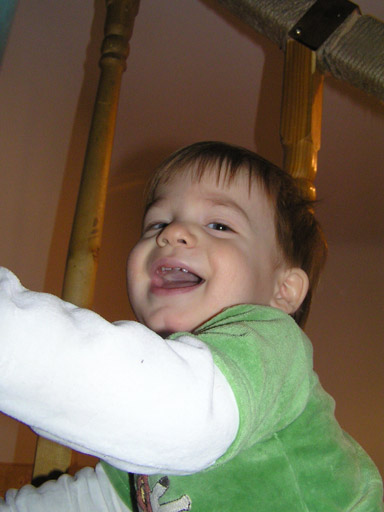 Még mindig nagyon szeret lépcsőt mászni, néha még a széket is sikerül eltolnia ügyesen, amit azért tettünk oda, hogy ne bírjon felmenni. Aztán ha sikerül a művelet vagy valamiért fel kell mennem és mondom, hogy na most felmászhatsz, akkor egyből jön és mászik ezerrel felfelé. Most már vagánykodik is, megáll az egyik lépcsőfokon, néha lenéz, megtapogatja a korlátot utána megvizsgálja a lépcsőket is , majd hátra fordul és vigyorogva magyaráz nekem, nem értem mit, de biztos valami olyasmit, hogy nézd anya, milyen ügyes vagyok már.