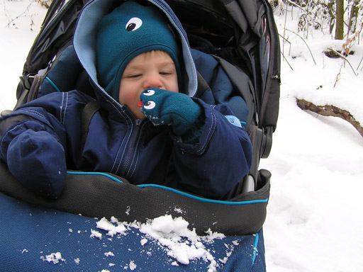 Megismerkedett közelebbről a hóval is, gyúrtunk neki hógolyókat és odatettük a a lábzsákjára, így Ő is meg tudta fogni, még meg is kóstolta az egyiket, kicsit meglepődött milyen hideg.