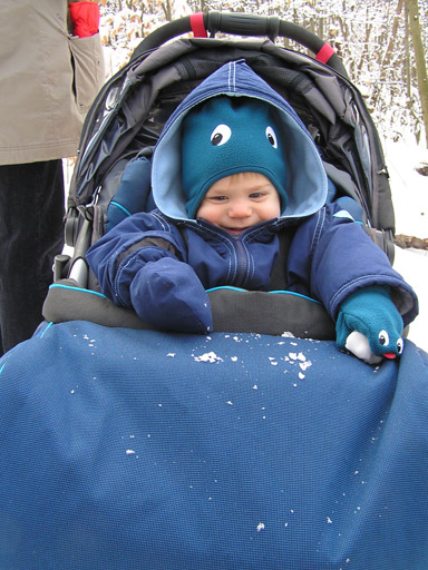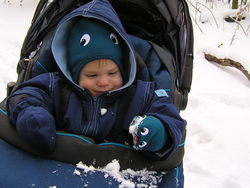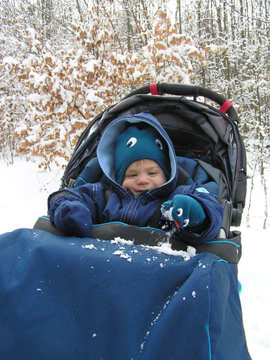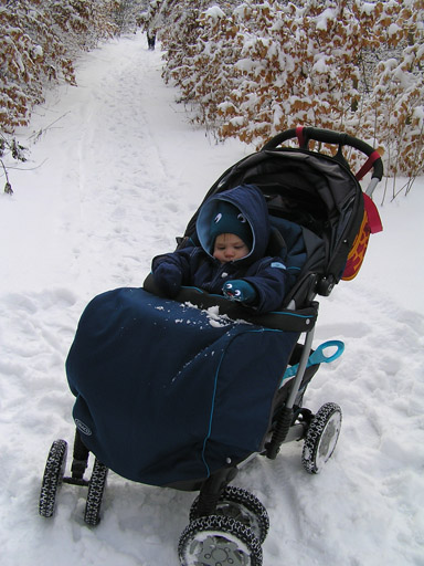 Jó nagy hó volt, szerencsére nem volt annyira hideg, sütött a nap is, pár fokkal volt csak 0 fok alatt, a táj csodálatos volt, a fák és bokrok ágait belepte a hó és amerre sétáltunk még az úton se volt letaposva nagyon a hó. Így néha nehéz volt tolni a kocsit, volt ahol akkora volt a hó, hogy elakadtam vele, ilyenkor Andris és Attila húzták felfelé a kocsit, mert a mély hóban elmerültek a kerekek, Levinek ez persze nagyon tetszett vigyorgott amennyire a hidegben tudott.