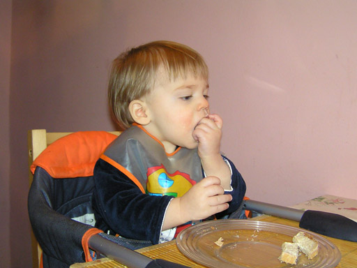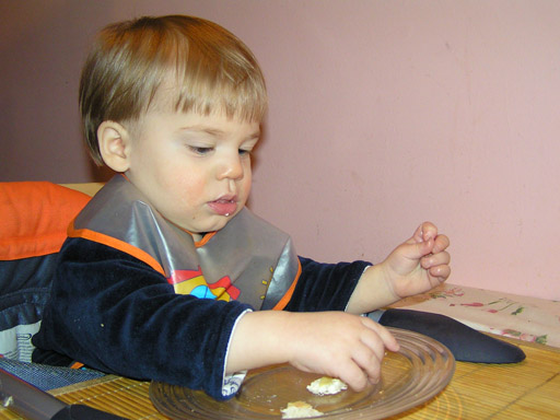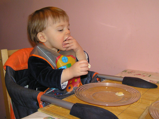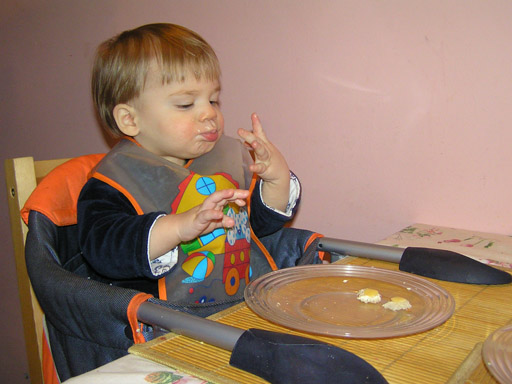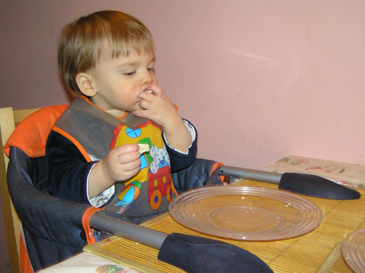 Levi igazi nagy kajás, bár szerencsére nem látszik rajta de nagyon sokat tud enni, ha valami a fogára való. De nem panaszkodhatok rendes kölyök, eddig mindent megevett, amit elé tettem, legyen az főzelék, zöldség vagy gyümölcs. Persze vannak abszolút kedvencek; a vajas kenyér sajttal vagy a főtt rizs bármivel (húsival vagy zöldséggel), de azt vettem észre, hogy szereti a leveseket is. Itt éppen a vajas sajtos kenyeret eszegeti, azaz inkább tömi magába, de a látszat ellenére kisfiam nem egy hete evett utoljára, hanem csak pár órája.