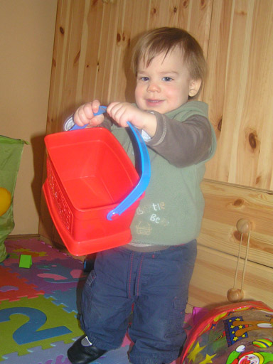Levi egyre stabilabban jár és áll. Persze magában állni vagy járni unalmas lenne, mindig van valami még pluszban a kezében. Éppen a FP formabedobó vödörből borította ki a formákat és nagy örömmel hozza nekem.