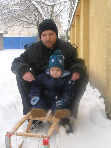 Ma még mindig esett a hó, de nem volt nagyon hideg így délután kimentünk Levivel együtt. Krisztiék (ők a szomszédaink) kölcsön adták a szánkójukat, hogy Levit megszánkóztassuk kicsit. Míg én havat lapátoltam Andris a ház körül húzta Levit a szánkón. De Levi a nagy nézelődésben nem kapaszkodott eléggé és leborult a szánkóról, bele a hóba, ettől kicsit meglepődött, de nem vette zokon.