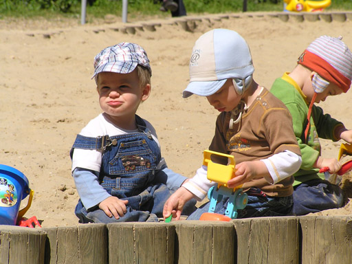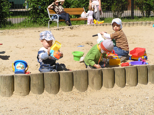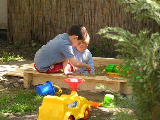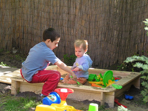 Levi Matyival homokozik a kertben 25-én délelőtt