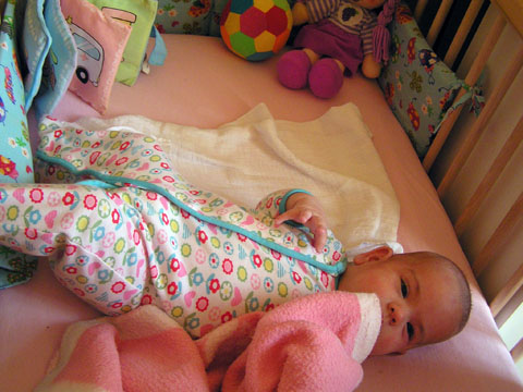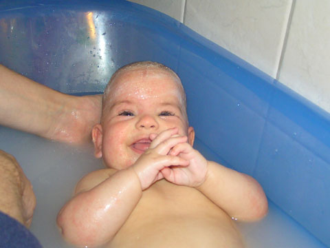 Iza baba már nagyon mozgékony percek alatt megfordul már a hátán a kiságyban. Most is éppen keresztbe fekszik, és a lábát feltette a kiságyban lévő rácsvédőre. Amit csak megkaparint a kezébe azt meg is kóstolja, a takaró az egyik nagy kedvenc. Ezt a rózsaszín takarót Judit barátnőm kislányától Anditól örököltünk meg. Szereti nagyon az esti fürdést is; csapkod a lábaival és szereti ha a pocakjára öntjük a vizet. Még a hajmosás se mossa le arcáról a mosolyt. |