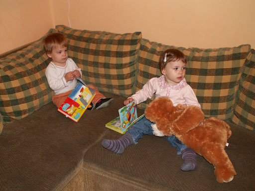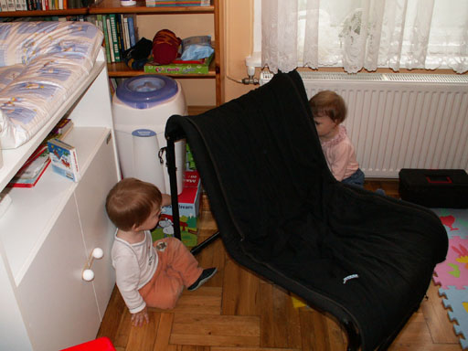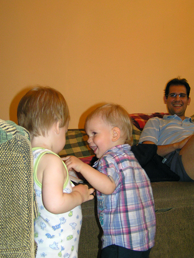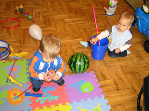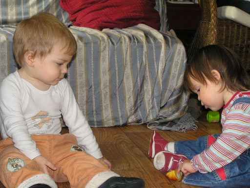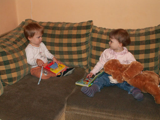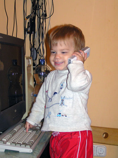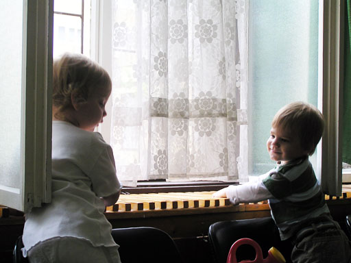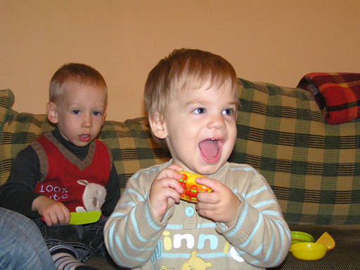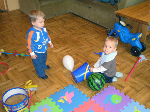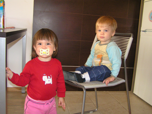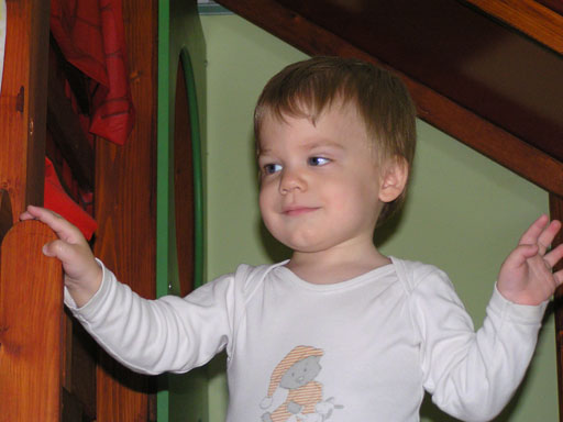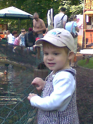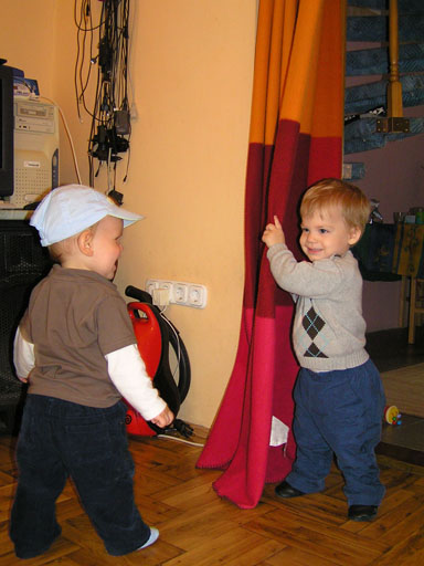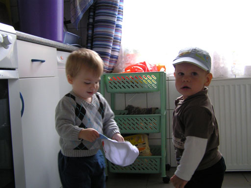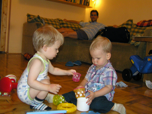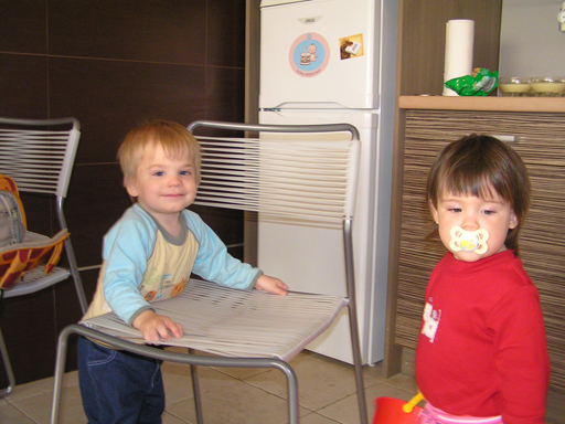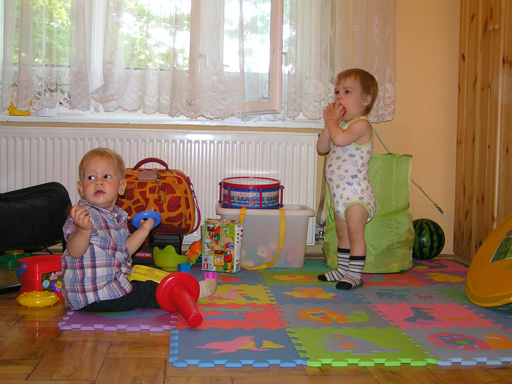 Ma délelőtt a Zenedében megismert Janka és Kismiki jött hozzánk látogatóba. Levi első körben nagyon védte a játékait, minden elvett Kismikitől, hiába mondtam neki, hogy csak játszik vele, nem veszi el tőle, bár nem hiszem, hogy nagyon értette volna mit magyarázok neki. Később már jól eljátszottak együtt is; sőt mikor Kismiki felvette a sapiját akkor Levi is kért egyet tőlem, amit Ő is felvett és abban mászkáltak együtt föl-le a lakásban. Majd következett a függönyös játék, ezen jókat kacarásztak, ahogy elbújtak egymás elől és cibálták a függönyt. A nagy függöny cibálásban elfáradva, megpihentek pár percig és közösen rajzoltak Janka segítségével. Június 3. Mivel még mindig nyoma se volt a nyárnak és a jó időnek, így megint benti játszós délutánt szerveztünk Krisztiékkel. A változatosság kedvéért most Ők jöttek át Levivel. Volt közös főzőcskézés és persze minden játékot előszedtek és kipróbáltak, úgyhogy pár perc alatt tele lett a szoba már alig fértünk el a földön a sok játéktól. aztán megjött Apa személyében a felmentő sereg és mindkét Levi rajta csüngött egy perc múlva, na meg persze a számítógéphez próbáltak odaférni Andris öléből. Mondtam is Andrisnak szokja a helyzetet, mert ilyen amikor 2 gyereke van az embernek :) Ma délelőtt szerencsére nem esett így sikeresen eljutottunk Levivel Erikához az szokásos pénteki ÖTYÉ-re. Míg Éváék megérkeztek Levi Kisandris szobájában ütötte el az időt, míg mi Erikával beszélgettünk. Kis anyai segítséggel felmászott a várba az oldalsó mászókán majd lecsúszott ülve vagy hason, ahogy éppen kijött a lépés. Aztán ezt egy idő múlva megunta és inkább az evőeszközöket pakolta a konyhában, majd megpróbálta bekapcsolni a tévét és a számítógépet, ezt nem hagytuk, így kénytelen volt a IP telefonnal vigasztalódni. Aztán megjöttek Éváék is és így Liloval együtt ment a telefonálás és rohangálás föl-le, néha megpihentek pár másodperc erejéig, aztán folytatódott a felfedezés és pakolászás. Átvittük Levi babakonyháját, hogy legyen mivel játszani a gyerkőcöknek. Lilonak is megmutattuk, nagy sikert arattak a szétvágható élelmiszerek, volt közös főzőcske is Éva segédletével. Aztán persze volt igazi tízórai is, kis zöldalma, gyümölcstea és egy kis perec. Június 5. Délután családilag Tibivel együtt kivonultunk a Margitszigetre egy kis sétára, aznap volt a Sportsziget rendezvény is. Ez Levit még nem nagyon érdekelte, de így is akadt elég látnivaló: megnéztük a hajókat a Dunán, mászkáltunk a kolostor romoknál és ellátogattunk a szigeten lévő kis állatkertbe is, ahol Levi mint egy igazi "kacsafan", leragadt a kacsáknál és őket nézte ottlétünk alatt végig, hiába riszálták magukat a szabadon mászkáló fácánok és gólyák, rájuk se nézett. Június 8. Ma délelőtt a Madarász utcai kardiológiai szűrésen voltunk. Levit eléggé megviselte a vizsgálat; nagyon nem tetszett neki, hogy fel kell feküdnie a vizsgálóasztalra és még nyugton is kell maradnia, hogy megnézze a szívhangját a doktornéni. Aztán ez még nem volt elég még ráaggatnak egy csomó hideg bigyót az EKG-hoz, ez a kettő így együtt nála nem megy, volt nagy sírás-rívás. De ahogy elengedte a doktornéni, a sírás is abba maradt rögtön. Június 16. Ma a változatosság kedvéért megint esik reggel óta, Levi ennek megfelelően pörög ezerrel. Aztán egy spontán chatelés után meglátogatnak minket Líviáék Rózával, így legalább nem unatkoztunk délelőtt. Aztán véget ért az idill és beindultak a kölyök: volt közös lámpa kapcsolgatás, azaz először Levi megmutatta, hogy kell felmászni a kanapéra, hogy elérje a lámpát, aztán Róza is leutánozta hibátlanul a mutatványt.