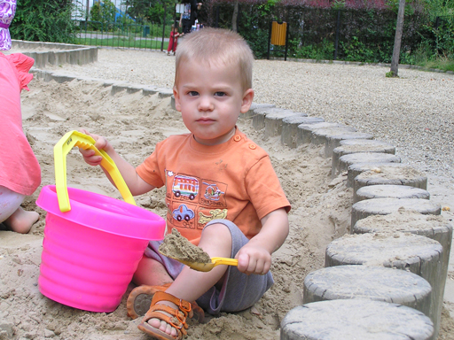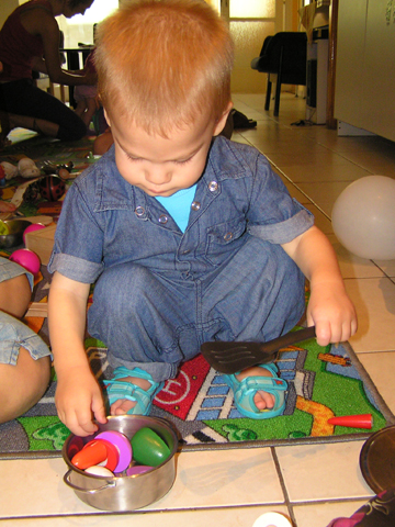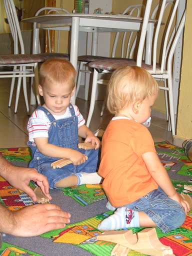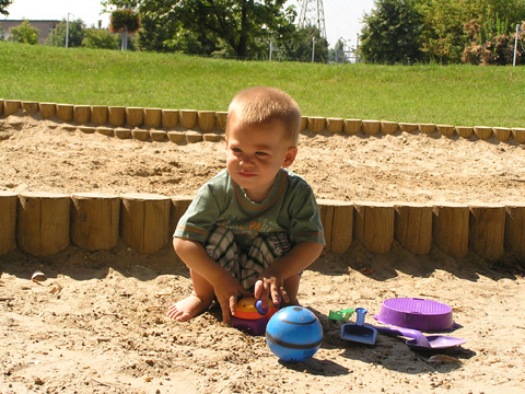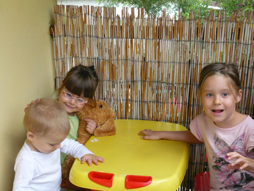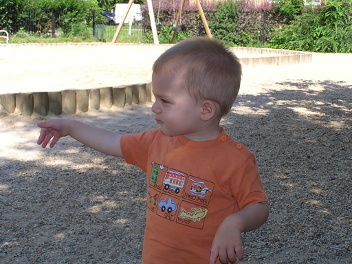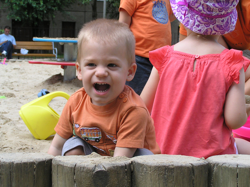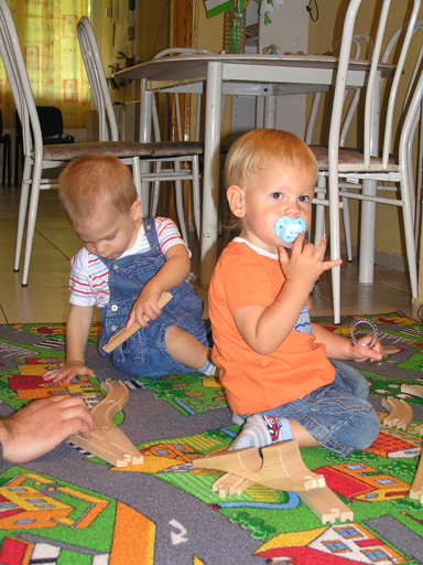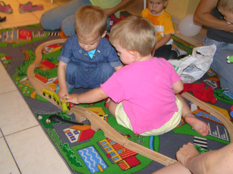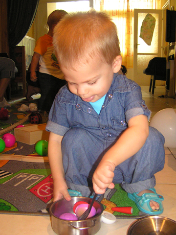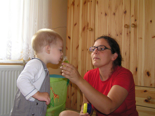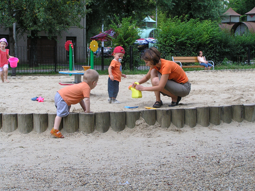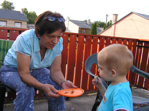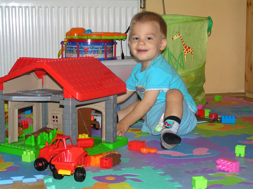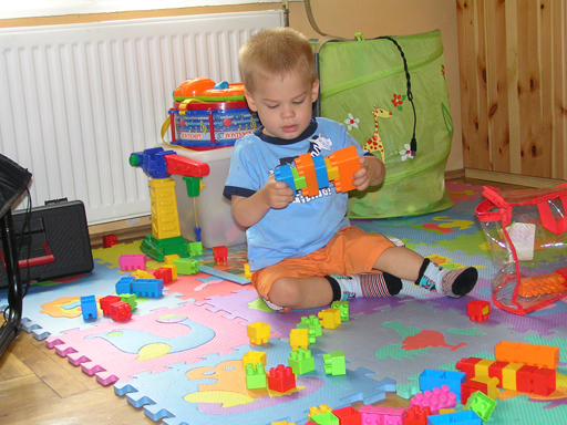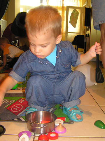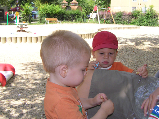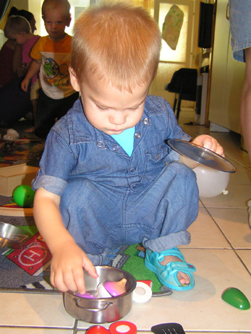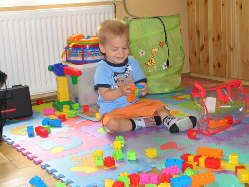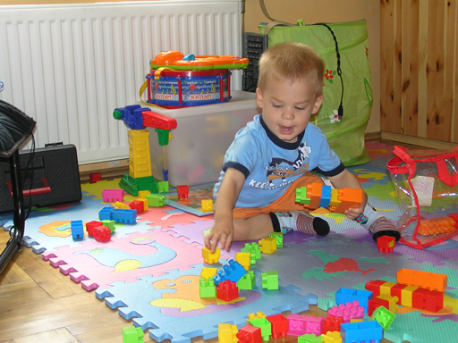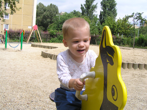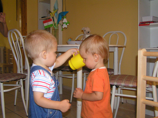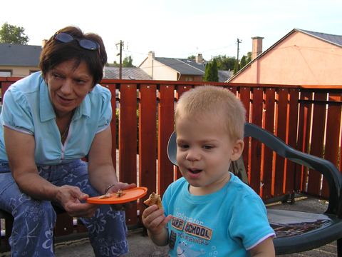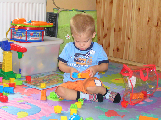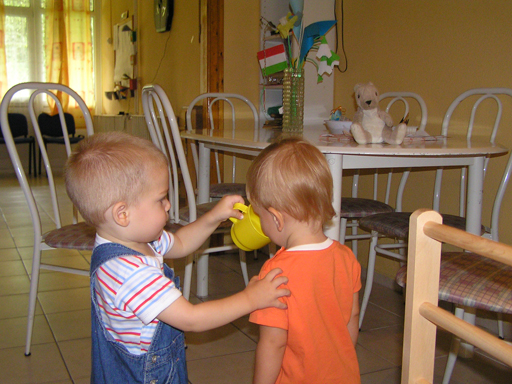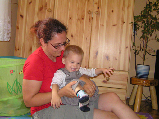 Augusztus 8. Ma délelőtt Lacáékat látogattuk meg, korán mentünk ott ebédeltünk és úgy volt, hogy Levi alszik is majd egyet ebéd után, amiből persze semmi nem lett. A lányok nagyon izgatottan várták Levit, készültek neki játékokkal, finom vakondtúrás tortával, amiből Levi tisztes adagot be is vágott. Ebéd előtt volt nagy közös kergetőzés és hancurozás a nagyszobában az ülőgarnitúrán. A finom ebéd után, míg a lányok is pihentek egy kicsit, megpróbáltam Levit is lefektetni, de gyorsan kudarcot vallott ez a próbálkozásom; bár kicsit álmos volt,de nem volt hajlandó elaludni, gondolom ennyi izgalom és esemény mellett nem volt túl sok kedve aludni. Délutánra egész jó idő lett, kisütött még a nap is, így Levi a lányokkal és Évivel kiment az erkélyre piknikezni. a közös ücsörgés után volt közös takarítás is, itt éppen Levi tart bemutatót a lányoknak Augusztus 10. Kanga klub Délelőtt elsétáltunk a Kanga klubba Levivel. Zsuzsi és István ma nem volt, de Hajni egyedül is állta a sarat és szuper játékokat játszottunk. Mire mi megérkeztünk Almáék és Petráék már ott voltak, Levi segített letenni a másik játszószőnyeget is, hogy kényelmesen elférjünk mind, aztán persze mindenáron össze akarta tekerni újra. Hajni megmutatta nekik a babzsákot, aminek az lett a vége, hogy kiszórták Petrával az összes babot és utána próbáltuk összeszedni. A babos buli után jött a főzöcskézés, Levi kimerte a lábosba az összes fazöldséget és gyümölcsöt, majd lelkesen kevergette a lábosban őket. Készül a sín a vonatoknak, Levi is segített az építésben. Mikor kész lett Petrával tologatták rajta a vonatokat. Levi brüm-brüm hangeffektekkel kísérte az eseményt, de sikerült neki megmagyaráznom, hogy ez vonat, nem autó és ez inkább sihuhu. Lassan közeledett az ebéd idő, de volt még egy kis idő Levi kedvencére az alagutas játékra, ezt nagyon szereti, mindig kacag, mikor valaki bebújik az alagutba majd kibukkan belőle. Augusztus 11. Délelőtt Jankáékkal kimentünk a játszótérre. Levi egyből mutatta a kukákat vagy ahogy Ő hívja a bumm-bumm-ot. Még nem sikerült megfejtenem honnan ered ez az elnevezés, de aranyos, ahogy mondja. Felmérte a terepet és megmutatta nekem szerencsére most csak messziről, hogy hol vannak a kukák. Aztán megjöttek Jankáék is Kismikivel. Volt csúszdázás bár Levi leginkább csak nézte, ahogy Kismiki lecsúszik. és persze a közös falatozás se maradt el, aminek én annyira nem örültem, mert ki fog így rendesen ebédelni, ha tele eszi magát rágcsával. Míg kint voltunk azalatt bedöntött 3 dl almalevet is, bár szerintem nem is szomjas volt, hanem tetszett neki, hogy ebből a kupakos palackból ihat. De szavam nem lehet, mert azért a kelkáposztafőzelékből is egy nagy adagot megevett ebédre. A nagy falatozás után jött a homokozás, ki kézzel, ki kannával, amit éppen talált kéznél. Janka homok gombócokat gyúrt a gyerekeknek, amit aztán eldobtak és nagyon tetszett nekik, hogy szétesik, ahogy lepuffan a homokba. Levi közben kézzel majd lapáttal dobálta ki a homokozóból a homokot, míg nem sikerült neki megmagyaráznom, hogy inkább a homokozóba dobálja a homokot, ne ki. Később talált egy vödröt és egy lapátot amivel lelkesen lapátolta a homokot a vödörben, majd kiöntötte belőle az egészet és kezdte újra a lapátolást. Augusztus 12. Levi nagy kedvence ez a farm ház és persze a hozzá tartozó traktor, állatok és kockák. A traktorba ki-be pakolja a kockákat és az állatokat és hangkísérettel tologatja a házba ki-be. Persze mikor rálép az ember a kis kockákra, akkor nem tűnik annyira jó játéknak már. Délelőtt Líviáékkal kilátogattunk a játszótérre, jó rég találkoztunk már, úgyhogy volt miről beszélgetünk míg a gyerkőcök játszottak. Kipróbálták a mérleghintát, nagyon vagányan csücsültek rajta, aztán Levi hamar megunta és lepattant róla. Levi itt is felmérte az összes kukát, de szerencsére most egyiket se fogta meg, csak megmutatta, merre vannak. Felmérte az egész játszóteret, megrázta itt-ott a kerítést és a kaput, majd felmászott az egyik padra és onnan szemlélte a többieket. Aztán mikor meglátta, hogy Róza eszik és iszik, neki is rögtön eszébe jutott az evés-ivás. Megkapta a maga itókáját amit meg is ivott az utolsó cseppig, majd Lívia adott neki Róza banánjából, amit szintén jóízűen elfogyasztott. Még jó, hogy itthon rá se nézz a banánra, de persze, ha Lívia adja az sokkal finomabb. Délután a kertben a szomszéd lánykákkal Rozival és Dorkával játszott Levi. Volt nagy közös homokozás, alig fértek el a sok homokozó játéktól, de azért megoldották és kapott Levi homok fagyit is. és Rozi épített egy nagy homokvárat is Levinek. Dorkával próbálják pörgésre bírni a szél forgót Augusztus 13. Míg én az ebédet csináltam, Levi a szobában építőkockázott. Napról napra ügyesebb, most már nem csak egymásra pakolja toronyként az egyforma méretűeket mint az elején, hanem alkot is a maga módján. Levivel ma együtt kukoricáztunk, mert uzsira főtt kukoricát kapott. Csak néztem milyen profi technikája van a szemek lerágcsálására. Délután a fiúk biciklizni mentek, azaz Andris tekert, Levi pedig kommentálta az eseményeket: minden huppanónál közölte, hogy hoppá. Most már hagyja, hogy a sisakot is rátegyünk és persze a végén nem akar kiszállni a biciklis ülésből. Augusztus 15. Délután Liláékhoz voltunk hivatalosak egy bográcsos partyra Solymárra. Szerencsére mire kiértünk az eső is elállt és a nap is kisütött. Lillával előkészítettük a babgulyáshoz az alapanyagokat, Léna segített a tűzhöz cipelésben, míg Levi leginkább csak kóstolgatott. Majd később felfedezte, hogy milyen jó buli, ha az ajtót és a