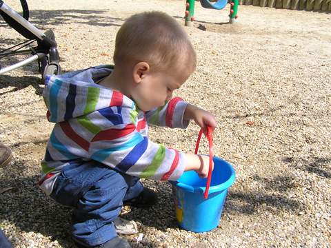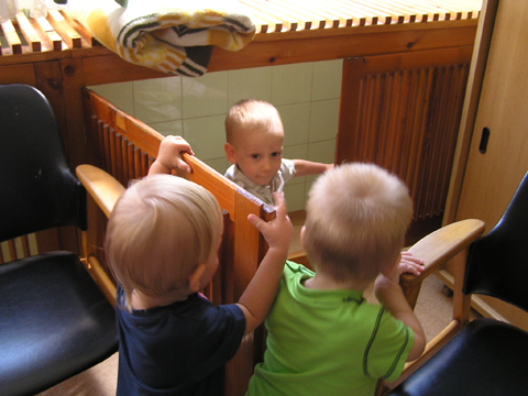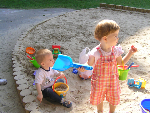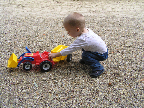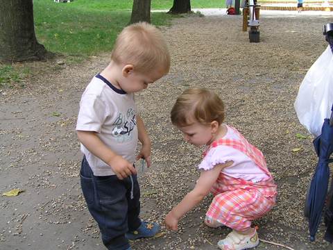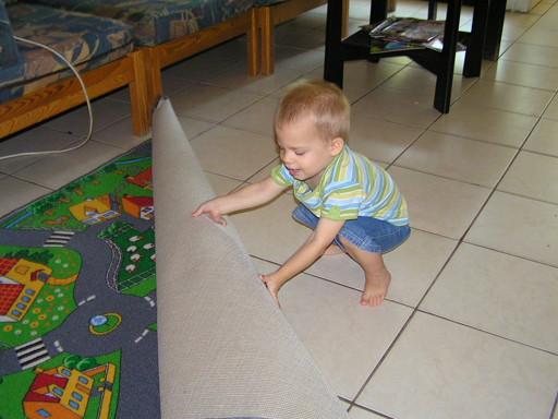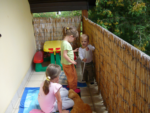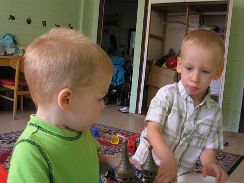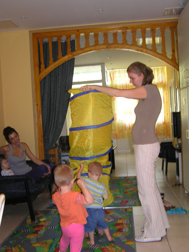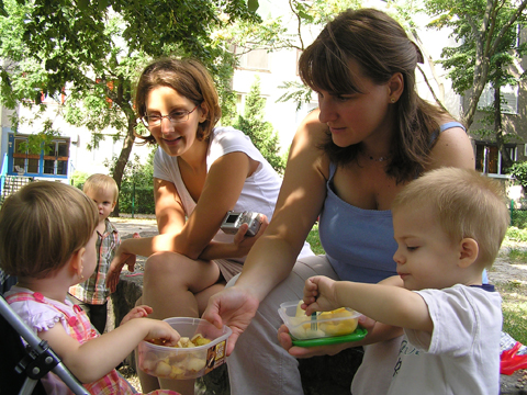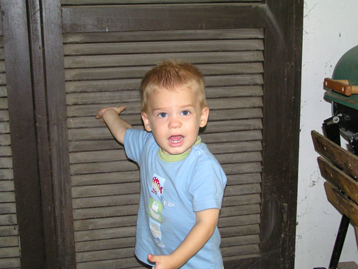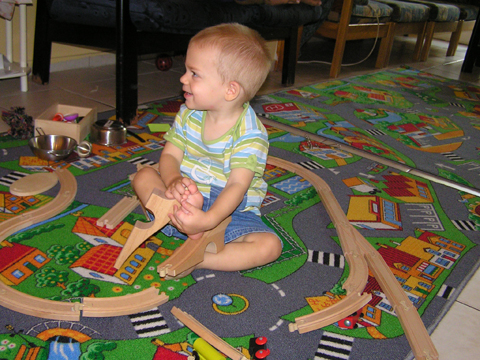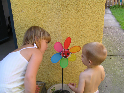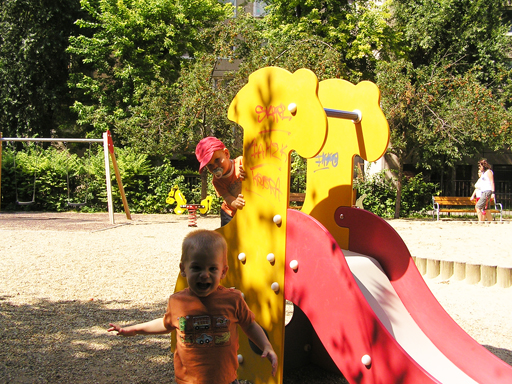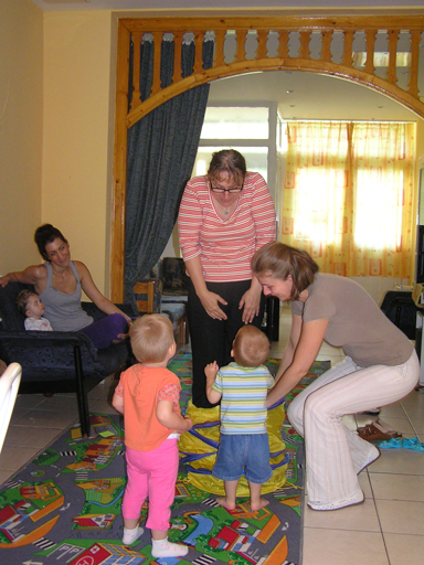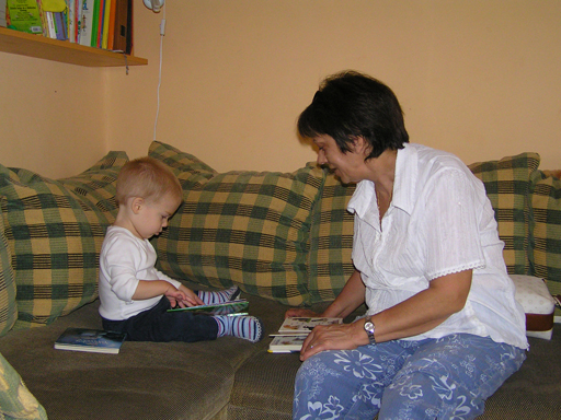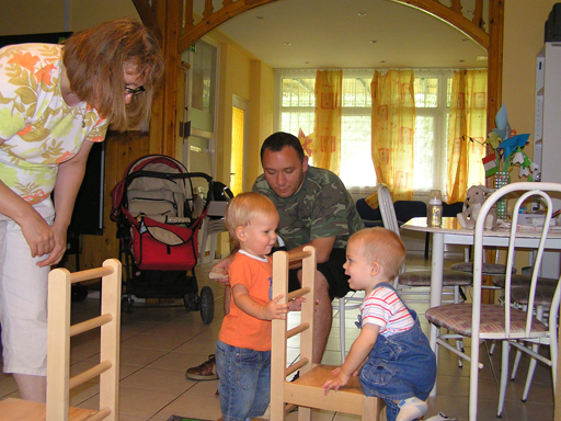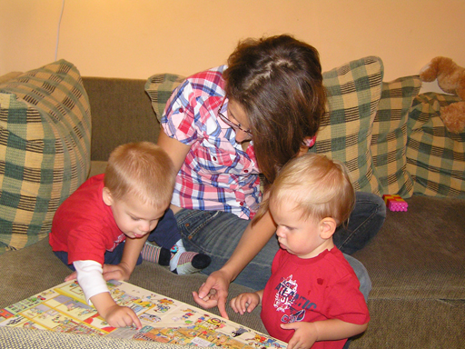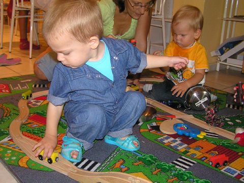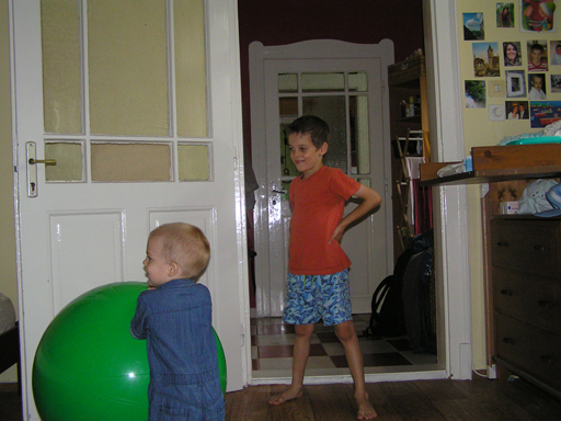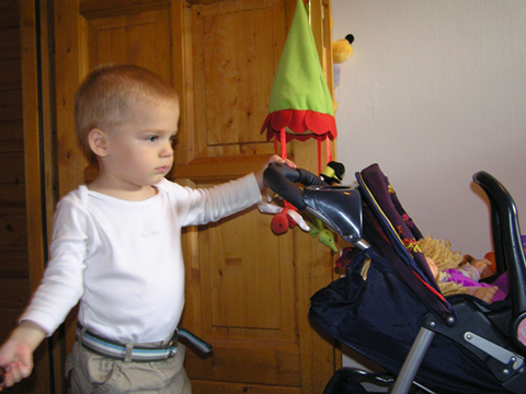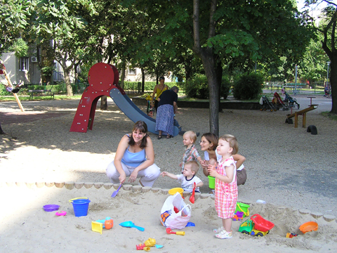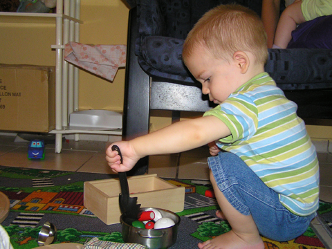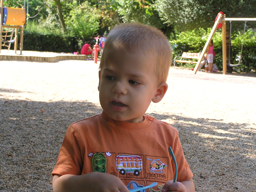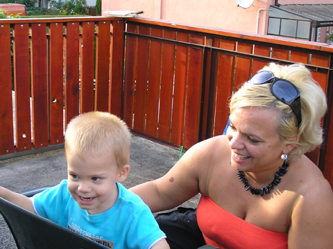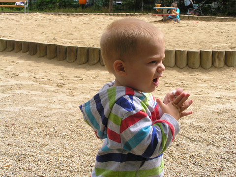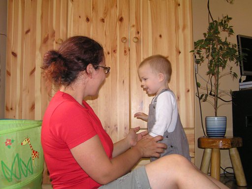 Augusztus 8. Ma délelőtt Lacáékat látogattuk meg, korán mentünk ott ebédeltünk és úgy volt, hogy Levi alszik is majd egyet ebéd után, amiből persze semmi nem lett. A lányok nagyon izgatottan várták Levit, készültek neki játékokkal, finom vakondtúrás tortával, amiből Levi tisztes adagot be is vágott. Ebéd előtt volt nagy közös kergetőzés és hancurozás a nagyszobában az ülőgarnitúrán. A finom ebéd után, míg a lányok is pihentek egy kicsit, megpróbáltam Levit is lefektetni, de gyorsan kudarcot vallott ez a próbálkozásom; bár kicsit álmos volt,de nem volt hajlandó elaludni, gondolom ennyi izgalom és esemény mellett nem volt túl sok kedve aludni. Délutánra egész jó idő lett, kisütött még a nap is, így Levi a lányokkal és Évivel kiment az erkélyre piknikezni. a közös ücsörgés után volt közös takarítás is, itt éppen Levi tart bemutatót a lányoknak Augusztus 10. Kanga klub Délelőtt elsétáltunk a Kanga klubba Levivel. Zsuzsi és István ma nem volt, de Hajni egyedül is állta a sarat és szuper játékokat játszottunk. Mire mi megérkeztünk Almáék és Petráék már ott voltak, Levi segített letenni a másik játszószőnyeget is, hogy kényelmesen elférjünk mind, aztán persze mindenáron össze akarta tekerni újra. Hajni megmutatta nekik a babzsákot, aminek az lett a vége, hogy kiszórták Petrával az összes babot és utána próbáltuk összeszedni. A babos buli után jött a főzöcskézés, Levi kimerte a lábosba az összes fazöldséget és gyümölcsöt, majd lelkesen kevergette a lábosban őket. Készül a sín a vonatoknak, Levi is segített az építésben. Mikor kész lett Petrával tologatták rajta a vonatokat. Levi brüm-brüm hangeffektekkel kísérte az eseményt, de sikerült neki megmagyaráznom, hogy ez vonat, nem autó és ez inkább sihuhu. Lassan közeledett az ebéd idő, de volt még egy kis idő Levi kedvencére az alagutas játékra, ezt nagyon szereti, mindig kacag, mikor valaki bebújik az alagutba majd kibukkan belőle. Augusztus 11. Délelőtt Jankáékkal kimentünk a játszótérre. Levi egyből mutatta a kukákat vagy ahogy Ő hívja a bumm-bumm-ot. Még nem sikerült megfejtenem honnan ered ez az elnevezés, de aranyos, ahogy mondja. Felmérte a terepet és megmutatta nekem szerencsére most csak messziről, hogy hol vannak a kukák. Aztán megjöttek Jankáék is Kismikivel. Volt csúszdázás bár Levi leginkább csak nézte, ahogy Kismiki lecsúszik. és persze a közös falatozás se maradt el, aminek én annyira nem örültem, mert ki fog így rendesen ebédelni, ha tele eszi magát rágcsával. Míg kint voltunk azalatt bedöntött 3 dl almalevet is, bár szerintem nem is szomjas volt, hanem tetszett neki, hogy ebből a kupakos palackból ihat. De szavam nem lehet, mert azért a kelkáposztafőzelékből is egy nagy adagot megevett ebédre. A nagy falatozás után jött a homokozás, ki kézzel, ki kannával, amit éppen talált kéznél. Janka homok gombócokat gyúrt a gyerekeknek, amit aztán eldobtak és nagyon tetszett nekik, hogy szétesik, ahogy lepuffan a homokba. Levi közben kézzel majd lapáttal dobálta ki a homokozóból a homokot, míg nem sikerült neki megmagyaráznom, hogy inkább a homokozóba dobálja a homokot, ne ki. Később talált egy vödröt és egy lapátot amivel lelkesen lapátolta a homokot a vödörben, majd kiöntötte belőle az egészet és kezdte újra a lapátolást. Augusztus 12. Levi nagy kedvence ez a farm ház és persze a hozzá tartozó traktor, állatok és kockák. A traktorba ki-be pakolja a kockákat és az állatokat és hangkísérettel tologatja a házba ki-be. Persze mikor rálép az ember a kis kockákra, akkor nem tűnik annyira jó játéknak már. Délelőtt Líviáékkal kilátogattunk a játszótérre, jó rég találkoztunk már, úgyhogy volt miről beszélgetünk míg a gyerkőcök játszottak. Kipróbálták a mérleghintát, nagyon vagányan csücsültek rajta, aztán Levi hamar megunta és lepattant róla. Levi itt is felmérte az összes kukát, de szerencsére most egyiket se fogta meg, csak megmutatta, merre vannak. Felmérte az egész játszóteret, megrázta itt-ott a kerítést és a kaput, majd felmászott az egyik padra és onnan szemlélte a többieket. Aztán mikor meglátta, hogy Róza eszik és iszik, neki is rögtön eszébe jutott az evés-ivás. Megkapta a maga itókáját amit meg is ivott az utolsó cseppig, majd Lívia adott neki Róza banánjából, amit szintén jóízűen elfogyasztott. Még jó, hogy itthon rá se nézz a banánra, de persze, ha Lívia adja az sokkal finomabb. Délután a kertben a szomszéd lánykákkal Rozival és Dorkával játszott Levi. Volt nagy közös homokozás, alig fértek el a sok homokozó játéktól, de azért megoldották és kapott Levi homok fagyit is. és Rozi épített egy nagy homokvárat is Levinek. Dorkával próbálják pörgésre bírni a szél forgót Augusztus 13. Míg én az ebédet csináltam, Levi a szobában építőkockázott. Napról napra ügyesebb, most már nem csak egymásra pakolja toronyként az egyforma méretűeket mint az elején, hanem alkot is a maga módján. Levivel ma együtt kukoricáztunk, mert uzsira főtt kukoricát kapott. Csak néztem milyen profi technikája van a szemek lerágcsálására. Délután a fiúk biciklizni mentek, azaz Andris tekert, Levi pedig kommentálta az eseményeket: minden huppanónál közölte, hogy hoppá. Most már hagyja, hogy a sisakot is rátegyünk és persze a végén nem akar kiszállni a biciklis ülésből. Augusztus 15. Délután Liláékhoz voltunk hivatalosak egy bográcsos partyra Solymárra. Szerencsére mire kiértünk az eső is elállt és a nap is kisütött. Lillával előkészítettük a babgulyáshoz az alapanyagokat, Léna segített a tűzhöz cipelésben, míg Levi leginkább csak kóstolgatott. Majd később felfedezte, hogy milyen jó buli, ha az ajtót és a