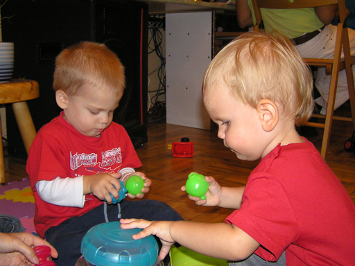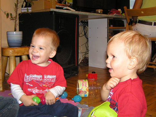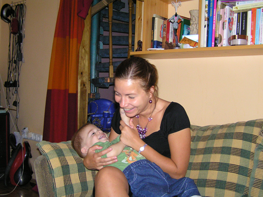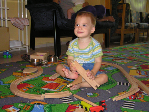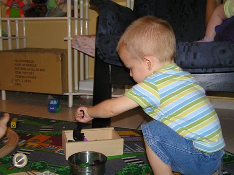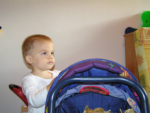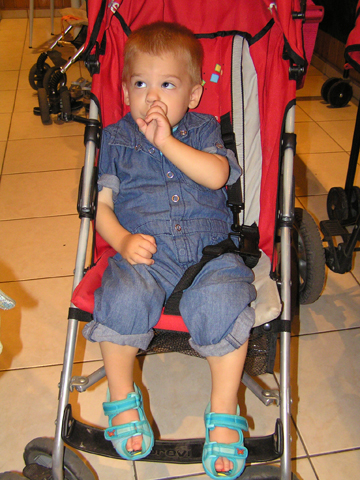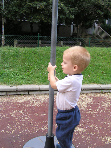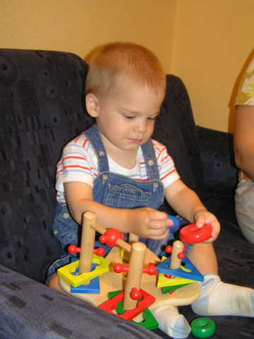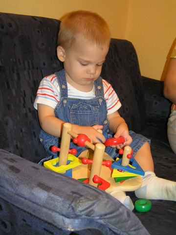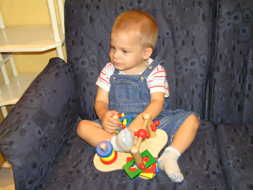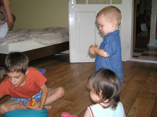 Délelőtt Kanga klubba mentünk Levivel. Szokás szerint nem akart kiszállni a babakocsiból, csak ült benne és onnan szemlélődött. Még Zsuzsi csalogatására se jött elő, aki megkereste neki a távirányítóját, amivel játszani szokott. Aztán mikor látta, hogy a többiek építik a pályát a vonatoknak Ő is nagy kegyesen kimászott a babakocsiból és csatlakozott a csapathoz. Istvánnal huncutkodik, elcsente tőle a vonatokat, majd odaadta Istvánnak és utána újra elszedte. Hajnival volt székes játék is, a fiúk lelkesen rázták a székeket a dal ütemére, amit énekeltünk. A játékban megszomjaztak a kicsik, Levi nagyon kedves volt, megkínálta, sőt meg is itatta Kismikit a poharából. Levi felfedezett a polcon egy nagy dobozt, amiben egy kézségfejlesztő játék volt. Kiszolgálta magát, levette a polcról, kiszedte a dobozból lecsücsült vele és miután Hajni megmutatta, hogyan kell használni, elmélyülten húzigálta le a karikákat és a különböző formákat. Alvás után villamossal átmentünk Erikáékhoz ötyézni, illetve a névnapomat is megtartottuk egy füst alatt a lányokkal. Kisandris is otthon volt, így a kicsik se unatkoztak volt kivel játszaniuk. Levi megtalálta a sarokban a nagy zöld labdát, nagyon tetszett neki, hogy ilyen nagy, még nem is látott ekkorát. Andrissal labdáztak is egy kicsit vele, azaz leginkább Levi lökte, Andris meg rúgta. Levi megcsodálta Marcit is testközelből Augusztus 4. Délelőtt játszótereztünk Krisztiékkel. Levi persze amint talált egy szemétnek valót - jelen esetben úgy döntött egy tiszta zsepiről, amit a táskában talált, hogy az már kidobni valót, közölte, hogy bum-bum - sietett vele a kukához. Vicces volt az idő, annyira hideg volt mikor elindultunk, hogy a csíkos pulcsira még adtam egy ujjatlan vastag mellényt is. Aztán mire kiértünk a játszótérre, már melegebb lett, lekerült a melllény és újabb tíz perc múlva mikor kisütött a nap is, megint 30 fok volt, így Levi végül már egy hosszú újjú bodyban lovacskázott. Újabb játékot talált ki magának, a kék vödörbe gyűjtötte a kavicsokat a földről. Ahol éppen kedve volt megállt és tett bele újabb néhány kavicsot vagy kiszórta az összeset a vödörből. Kölcsön vette a másik Levi csoda járgányát amit aztán a homokban és a kavicson is tologatott elmélyülten. Augusztus 5. Csilla beugrott hozzánk délután, Levi éppen akkor kelt fel, még kicsit bágyadt volt, de aztán pár perc alatt magához tért és produkálta magát. Megnézte mit kapott Csilla ajándékba, sőt meg is szagolta az olívás tusfürdőt. Aztán volt nagy hancúrozás és csikizés Csillával