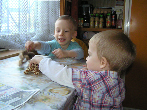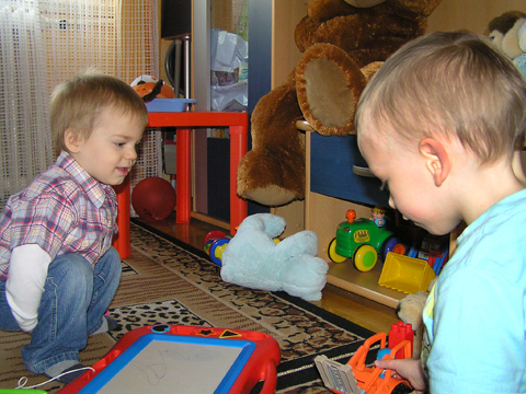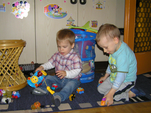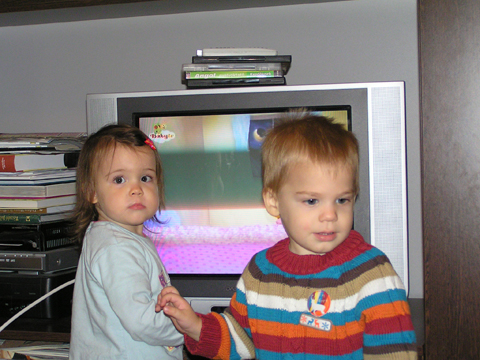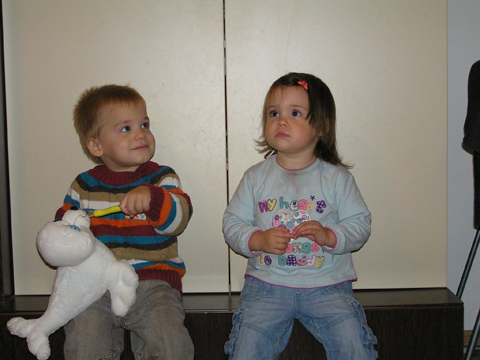 Délután Éváéknál ötyéztünk, Levi és Lilo ezerrel pörgött, bekapcsoltak és nyomogattak minden zenélő játékot, amit csak találtak mindannyiunk nagy örömért. Addig nyomogatták a tévén a gombokat, míg sikerült bekapcsolniuk, és persze 5 centire a képernyőtől nézték a mesét. Aztán mikor kikapcsolta Arzén a tévét, más játék után néztek, tologatták felváltva Lilo babakocsiját, néha volt egy kis vita, ki mivel játszik, de rosszalkodni már nagyon profin tudnak együtt is. Levi megetette a fókát is egy kiskanállal, ezt a Kanga klubban csinálta először kedden, ott egy babát itatott meg játékból, nem tudom kitől látta. Igaz eddig néha minket is megkínált, kedvesen, mikor Ő evett, de babát, állatkát eddig nem etetett még.