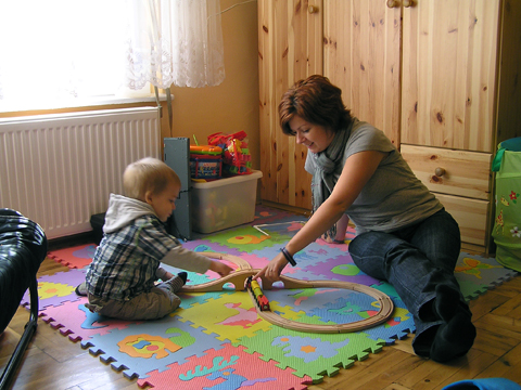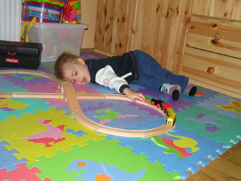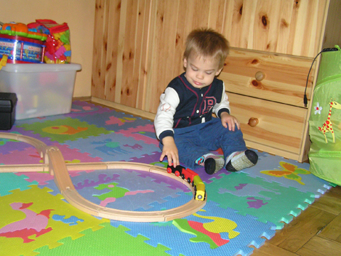 Délután megint előkerültek a sínek és a vonatok, most ez a kedvenc. Levi tologatta őket minden testhelyzetben: ülve és fekve is, hozzá hanghatásként brümmögött, hiába mutattam, hogy megy a vonat, neki maradt a brümmögés.