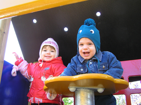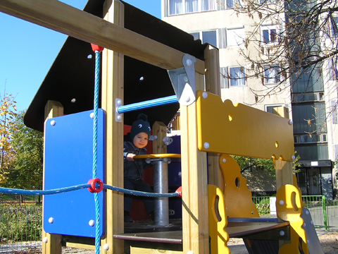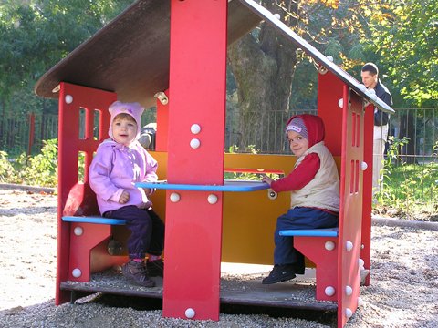 Délelőtt kisütött a nap, így a szokásos zárt teres keddi programok helyett inkább játszótérre mentünk Líviáékkal, kihasználva a szép őszi napsütést. Végre eljutottunk a Viola utcai játszótérre, amit pár hónapja újítottak fel és van benne egy kisház is. Jól sejtettem, hogy Levinek tetszeni fog a kisház; ahogy beléptünk már egyből szaladt oda és beült Rózával együtt.