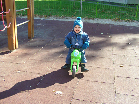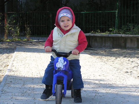 Ma bátor voltam és vittünk kismotort is magunkkal a babakocsira aggatva. Szerencsére a játszótéren volt kövezett rész is, így a lurkók motorozni is tudnak. Levi ki is használta az alkalmat és jó 20 percen át motorozott föl-le a játszótéren nagy elánnal.