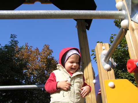 Kipróbálta a mászókát is, anyai segítséggel felmászott rá, gondolom ezt inkább ovis gyerekekre tervezték, mert elég magasak a létra fokai. Volt nagy örömködés és ugrálás a tetején és lecsúszás hason és háton a csúszdáról.