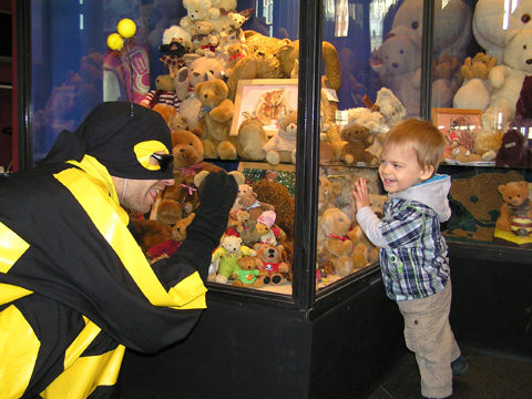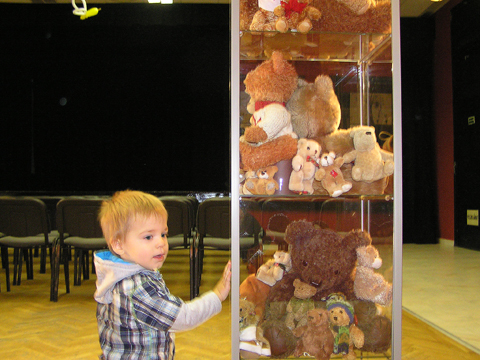 Líviáékkal megnéztük az UGYIH-ban a Méznap és Mackó-kiállítást. Nem voltak sokan, de azt hiszem a gyerekek így is jól érezték magukat. Megnéztük a sok-sok mackót, amiből kb. 700 db volt kiállítva a vitrinekbe. Levi lelkesen mutogatta a macikat az üvegen át, aztán persze felfedezte a kukákat, az a nagy fém ajtókat, az italkiadó automatát és a székeket a teremben.