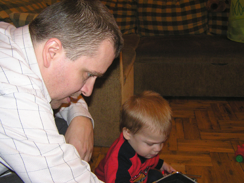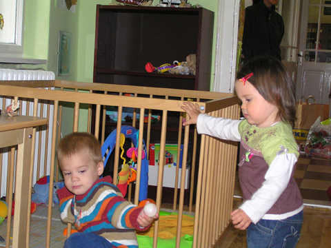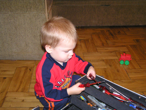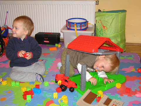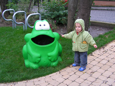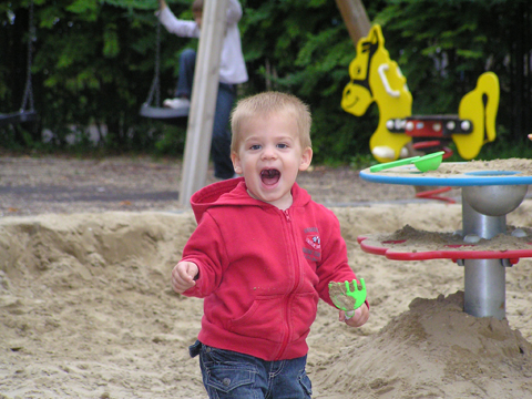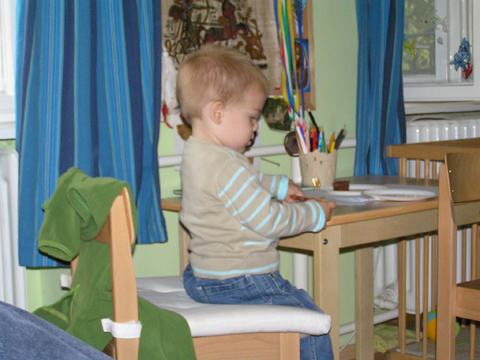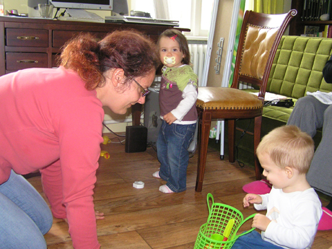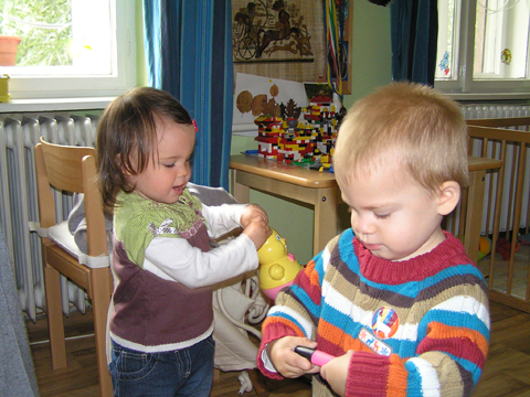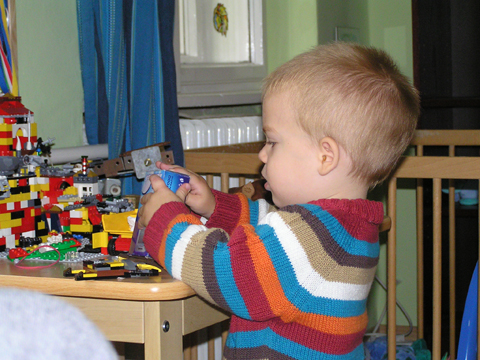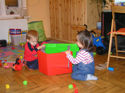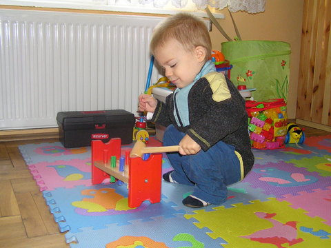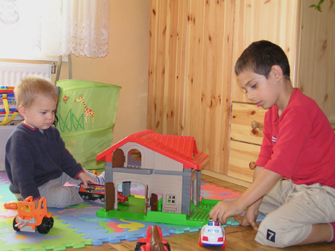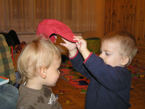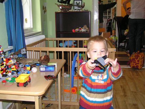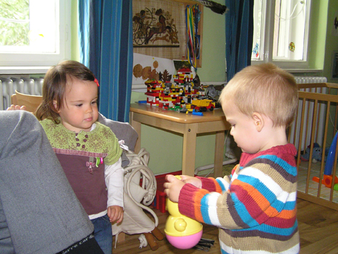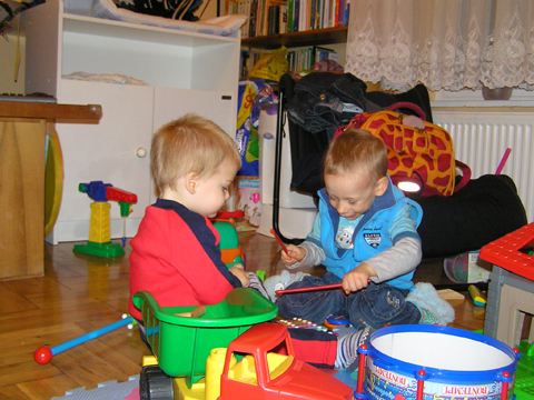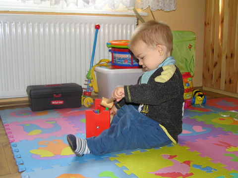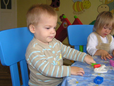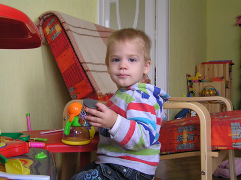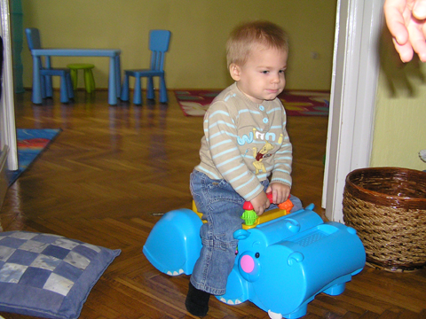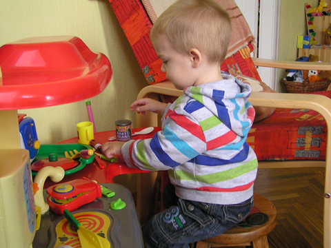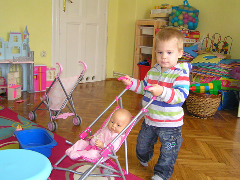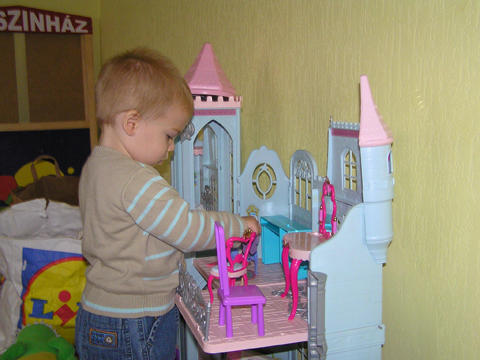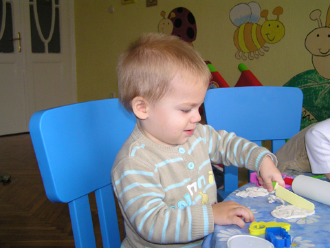A nagy simogatás után még Apával falatoztak egyet a pogikból majd körbesétáltuk a tavat és megnéztük a kutyaiskolát is. Szeptember 10. Nyertünk a Babapihenőbe egy kvízjátkon 4 órás bérletet, aminek nagyon megörültünk, mivel nem nagyon szoktam semmit nyerni. Ma délelőtt végre el is jutottunk, hogy megnézzük a helyet, ami nagyon szuper, van hatalmas kert, bent 2 nagy játszószoba sok-sok játékkal és kedves gondozók. Utána jött a játékok felfedezése, megcsodálta csajos sarokban a hercegnős kastélyt, át is rendezte az egyik szobát, tett bele néhány új bútort a nagy zacsiból. Később mutattam neki hogy van egy víziló formájú kisautó is, úgyhogy azzal is ment pár kört a szobában. Aztán jött a gyurmázás, Levinek ez nagyon tetszett, végre vághatott kedvére, lehetett nyiszatolni a gyurmát késsel, meg mindenféle eszközökkel formázni. Szeptember 15. Délelőtt Levivel elmentünk a Babapihenőbe. Levi ma egyedül képviselte a fiúkat, mert csupa leányzó volt körülötte. Kicsit meg is szeppent a lányoktól, de aztán pár perc alatt feloldódott. Mikor bátorságra lelt körbenézett a szobában és hamar felfedezte hogy a sarokban van egy kiskonyha is. Imádja a konyhai cuccokat, rögtön nekiállt kavargatni és pakolni az edényeket és az evőeszközöket. Talált egy babkonzervet is nagy örömére. Jött hozzám és mutatta, hogy nyissam ki, mondtam neki, hogy ez nem igazi és sajna nem tudom kinyitni. Később volt közös gyurmázás is, de Levit jobban érdekelték a polcon felfedezett busz és villamos, amit hangos hanghatással tologatott a parkettán. De azért kicsit tologatta a babakocsit is, mikor látta, hogy a lányok is tologatják, sőt igen zokon vette mikor az egyik kislány elvette tőle a babakocsiból a babát.