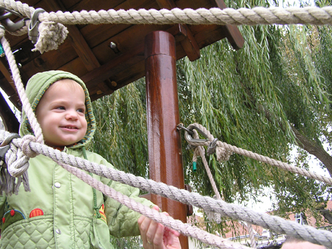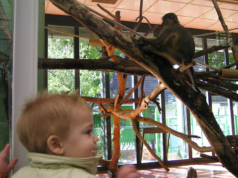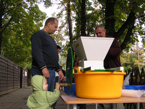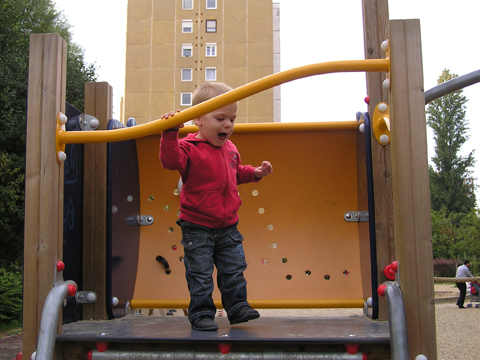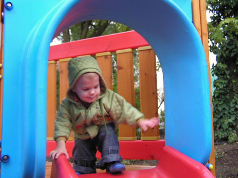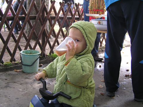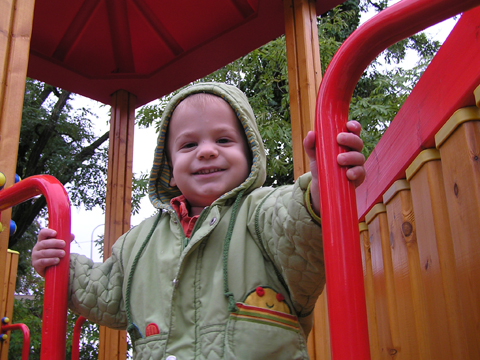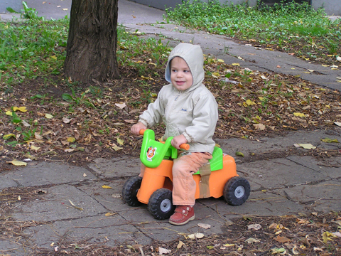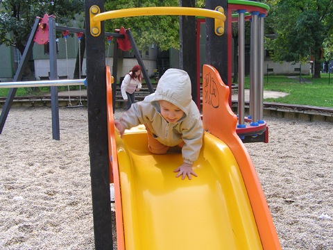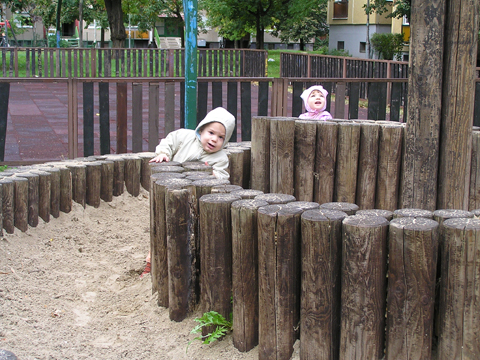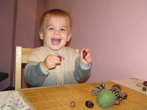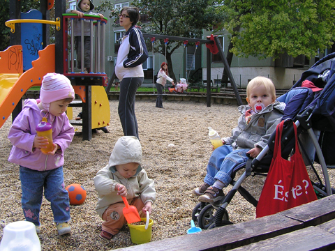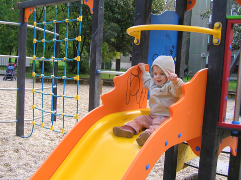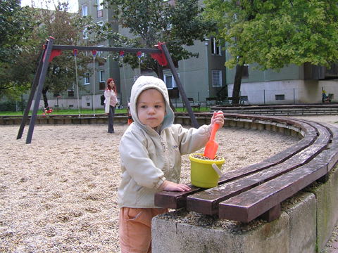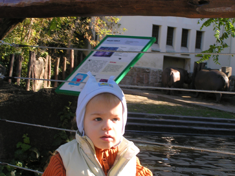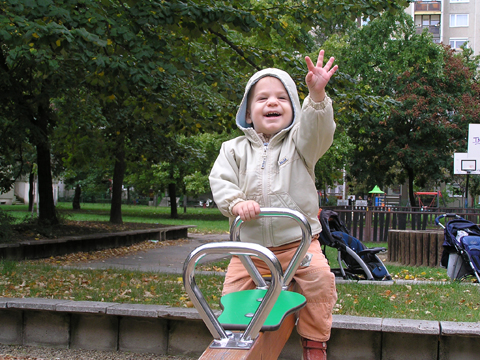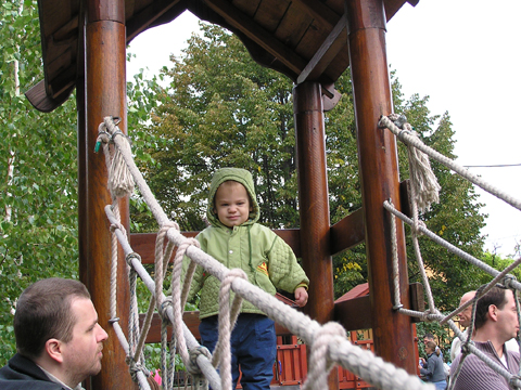 A figurák mellett mindenből volt egy kicsi ami egy jó játszótérre kell: fa mászóka csúszdával, mérleghinta, rugós játékok, homokozó és hinta és sok-sok pad, hogy a szülők is tudjanak hova ülni. Szeptember 22. Szeptember 25. Délelőtt szerencsére nem esett az eső, mert szabadtéri programra készültünk. Kriszti szólt, hogy a Vadgesztenye bölcsiben Mihály-napi vásár lesz és menjünk mi is. A belépő 1 kg szőlő volt, amiből a bejáratnál mustot lehetett készíteni. Levi is besegített a munkába. utána meg élvezte a munka gyümölcsét a mustot. Nagyon ízlett neki a szőlőlé, megivott belőle egy fél pohárral. Éhezni se éhezett az ovi kemencéjében igazi hamuban sült pogácsa sült, amit Levi is megkóstolt. A családi nap a bölcsiben nem csak evés-ivásról és játékról szólt. Egy csomó program is volt, nem csak gyerekeknek, hanem a szülőknek is. Volt vásár az ovisok által készített tárgyakból és kézműves foglalkozás is, ahol többek között lehetett őszi ajtódíszt készíteni, gesztenyéből, borostyánból és almából. A napokban éppen azon gondolkoztam hogy kéne egy őszi ajtódísz, így nagyon megörültem a lehetőségnek. Csináltam is egyet gyorsan mielőtt Levi megette volna az összes felszeletelt almát a hozzávalókból. Az udvaron talált egy csomó kismotort is, persze egyből fel is pattant az egyikre, és utána már le se szállt a második pohár mustot is nyeregből fogyasztotta el. Dél körül már láttam, hogy teljesen elfáradt, lecsücsült apa mellé és szopta az ujját is, úgyhogy elbúcsúztunk Krisztiéktől és mentünk haza, egyből elaludt ebéd után, úgy kifáradt a nagy nyüzsgésben. Miután felébredt Levi az ebéd utáni alvásból a családi kupaktanács úgy döntött, hogy kihasználjuk, hogy szépen süt a nap és elmegyünk egy kis kirándulásra a közelbe. Persze hegyek csak Budán vannak, úgyhogy autókáztunk egyet. A kocsit letettük a Fenyőgyöngye étteremnél található ingyenes parkolóba és onnan sétáltunk fel az Árpád-kilátóhoz. Vittük a babakocsit is, de Levi leginkább sétált. Ami azt jelentette, hogy csiga tempóban haladtunk, mert Levi minden neki tetsző fánál, virágnál és kőnél megállt és a saját kis nyelvén véleményt alkotott a látottakról. Hol csak magának beszélt, de legtöbbször velünk is megosztotta véleményét a látottakról. Felsétáltunk az Árpád-kilátóig, Levinek nagyon tetszett a sok lépcső, hol egyedül, hol apai segítséggel mászta meg. A kilátóban is fel-alá szaladgált, majd megpróbált felmászni a padra is, de magas volt neki, jd Andris felvette és együtt nézték meg a kilátást. Levi nagyon aranyos volt, meglátta a Dunát és mutatta lelkesen, hogy ott a víz. Szeptember 27. Délelőtt az újpesti mami klub keretében, arra gondoltam, hogy míg jó idő van menjünk ki játszótérre. Leszünk még eleget zárt helyen, ha jó a hideg idő. Úgyhogy kitettem egy cetlit az ajtóra, ha valaki jönne, hol talál meg minket és elmentünk a kavicsos játszótérre Líviáékkal. Jankáék már ott voltak mire odaértünk. Mikor megérkeztünk Levi nem akart felmászni a mászókára, se csúszdázni. Aztán látta, hogy Róza és Kismiki is lecsúszik, akkor már Ő is felment a mászókára és lecsúszott a csúszdán. Mikor megunták a csúszdát és a kavicsozást, átmentünk a fa játszótérre is, ahol mérleghintáztott Levi Kismikivel. Volt közös rönkvárazás, az elején még szépen körbementek, később már átmásztak ott ahol hiányzott egy farönk, így rövidítve le az utat. Aztán már csak felmásztak a farönkre és a másik oldalán lemásztak, tetszett nekik, hogy így is lehet közlekedni. Később a rönkvárazás után, Levi meglátta az egyik kisfiú motorját és egyből felpattant rá. Meglepődtem, mert eddig ilyet sose tett, hogy ráült más idegen motorra. Rá is szóltam, hogy ezt nem illik, előbb el kell kérni a tulajdonostól, de anyuka mondta, hogy nyugodtan mehetünk vele. Így miután engedélyt kaptunk a használatra, Levi elrobogott és tett egy nagy kört vele a játszótéren. Szeptember 29. Délelőtt kimentünk gesztenyét szedni Líviáékkal, majd a játszótéren csatlakoztak hozzánk Jankáék is. Így lassan összeáll az őszi asztali kosár minden alkotóeleme; van dió, mogyoró, makk, fenyő toboz, gesztenye és pár érdekes gumónk is. Levi nagyon szeret velük játszani, persze nem tudja még mondani csak a makkot, de a többit is felismeri már. Délután Kriszti jött át Levivel és meglepően jól eljátszottak a Levik, így mi nyugodtan teázunk és trécseltünk Krisztivel. Volt nagy közös zenélés is, Levim fújta a trombitát Levi pedig dobolt a szilifonon. Kihasználva a jó időt ma délelőtt kilátogattunk az Állatkertbe Líviáékkal. Az első állat amit megnéztünk az elefánt volt, Levi tetszését nem nagyon nyerte el, inkább rohangált egyet. Aztán meglestük a bumfordi vízilovakat, nagyon tetszett Levinek ahogy lubickoltak a vízben és mozgatják a fülüket. Aztán megnéztük a Majomház lakóit, Levinek nagyon tetszett ahogy ugráltak ágról ágra és az üveg miatt teljesen testközelből nézhette a majmokat. |
