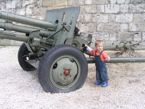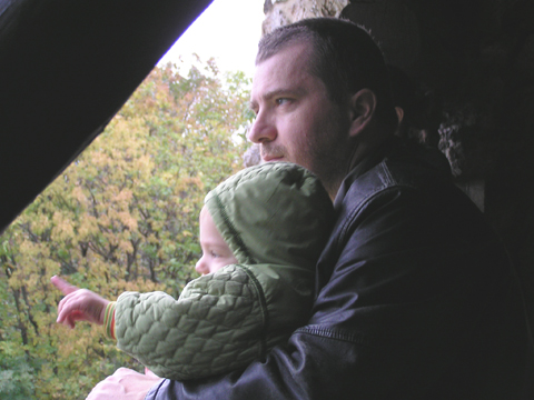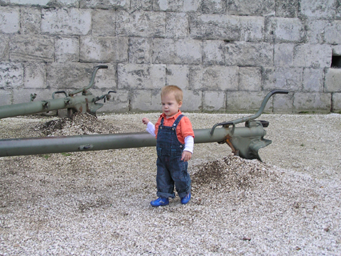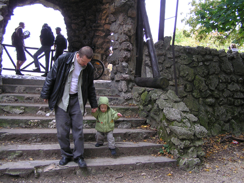 aztán Levivel a közös homokozásnál megszelídült, de azért a szokásos kapuzárás és kuka lökdösés nem maradt el, igaz már nem olyan hévvel csinálja, mint régebben. Szeptember 12. Délelőtt átjött hozzánk Nagypapi Matyival. Levi kapott Matyitól egy kis tűzoltóautót és egy markolót, nagypapitól meg két kis pólót, ugye nem kell mondanom minek örült jobban Levi. Estefelé pedig Jankáék jöttek hozzánk vendégségbe. A farmház itt is közkedvelt játék volt, Kismiki meg is próbált bemászni alá, amin jót derültünk mi is. Levi éppen Kismikit öltözteti, ráadja a sapkáját, ami a nagy játékban leesett. Délelőtt egészséges rendelésre mentünk Levivel, a doktornéni próbálta megvizsgálni, persze ez nem nagyon tetszett Levinek, nem maradt nyugton egy fél percre se. A száját meg semmi pénzért nem volt hajlandó kinyitni, hogy megnézze, hogy állnak a rágófogai, hiába udvarolt neki a doktornéni. Levi egy mozdulattal leszakította a nagyszobai függöny karnist. Szerencsére nem esett rá és nagyon meg se ijedt, de utána mutogatta, hogy nincs függöny az ablakon. Szeptember 18. Végre nem esett az eső, ezért délután a Jankáékkal tervezett Elevenparkos játszóház helyett Miki ötletére felsétáltunk a Citadellához. Leparkoltuk az autókat a Bérc utcánál és onnan sétáltunk gyalog a Citadellához. Levi jó nagy utat tett meg gyalog, nem is nagyon akart beülni a babakocsiba. Hagytuk hagyj sétáljon kedvére, csak ott vettük fel, ahol már nagyon meredeken ívelt felfelé az út.