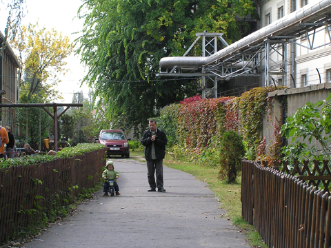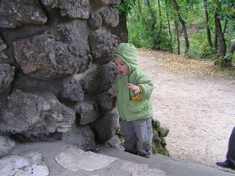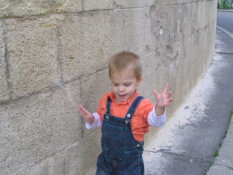 Aztán egyedül végigsétált a fal mellett (nem engedte, hogy fogjam a kezét se, így pár lépésről követtem a delikvenst) peckesen sétált a keskeny járdán miközben egyik kezével simogatta a követ.
