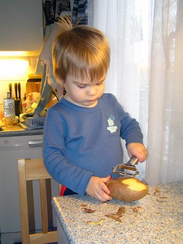 Levi rájött, hogyan tud krumplit pucolni a hámozóval. Így ha én krumplit pucolok, Ő is jön és bőszen pucolja kiszemelt krumpliját, amit utána el se lehet venni tőle, míg nem pucolta teljesen meg.