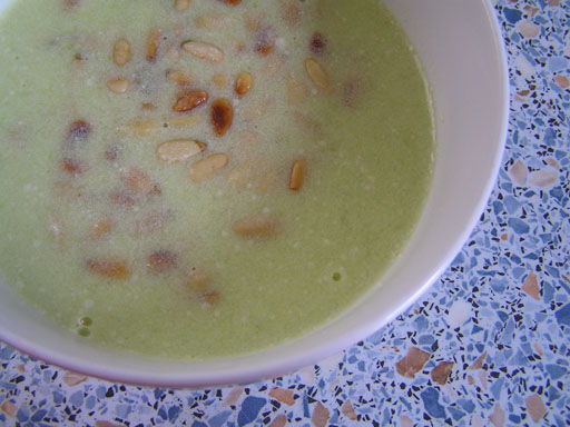 Spárgakrémleves pirított fenyőmaggal új Hozzávalók: 1 nagy fej brokkoli, 1 kisebb fej vöröshagyma, 1 nagy krumpli, 2 gerezd fokhagyma, 2 dl tej, 1 evőkanál margarin, liszt, 1 liter húsalaplé, só, fehérbors, szerecsendió, levesgyöngy vagy pirított kenyérkocka. Brokkolit rózsáira szedve megmossuk, a szárakat felszeljük. A krumplit meghámozzuk, megmossuk és apró kockára vágjuk. A hagymát is megpucoljuk és apróra vágjuk. A hagymát az 1 evőkanál margarinon üvegesre pároljuk. A brokkolit és a burgonyát hozzáadjuk, egy kicsit megpároljuk fedő alatt, majd hozzáadunk 1 evőkanál lisztet és megpirítjuk vigyázva ne égjen oda. Annyi húsalaplével öntjük, fel ami éppen csak ellepi, majd sózzuk, borsozzuk. Kb. 10-15 percig főzzük, míg meg nem puhul a burgonya és a brokkoli, majd hozzáöntjük a 2 dl tejet ízesítjük a szerecsendióval és a zúzott fokhagymával, majd felforraljuk az egészet. A levest botmixerrel pépesítjük és még visszatesszük egyet rottyani. Tálaláskor levesgyöngyöt vagy pirított kenyérkockát teszünk a tetejére. Tipp: tehetünk bele reszelt sajtot is illetve tej helyett készíthetjük tejszínnel is. Tetejét díszíthetjük pár kis méretű párolt brokkolirózsával is.