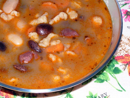Na ez a leves az ami bográcsban elkészítve, jó társaságban elfogyasztva az igazi. De jobb híján készülhet a tűzhelyen is, akkor is nagyon finom lesz. Hozzávalók: 25 dkg tarkabab, 1 szál fehérrépa, 2 szál sárgarépa, 4 gerezd fokhagyma, 1 kis fej vöröshagyma, 50 dkg füstölt sertéscsülök, olaj, 1 tojás, liszt, 3 babérlevél, fekete bors, só, 1 kk pirospaprika, tejföl. A száraz babot és a csülköt előző este beáztatjuk hideg vízben. Másnap a csontról levágjuk a húst, felkockázzuk és a csonttal együtt visszatesszük abba a vízbe amiben ázott és kis lángon félpuhára főzzük. Ekkor beleöntjük a babot és mikor a bab félig megpuhult hozzáadjuk a megpucolt vöröshagymát és a pucolt, karikákra vágott sárga- és fehérrépát is. Tipp: ha nagyon sósnak érezzük a csülköt, akkor öntsük le róla a fél vagy teljes főzőlevet és tiszta vízzel tegyük fel főni újra. A sós főzőlevet felhasználhatjuk más levesek pl. krémlevesekhez. Én le szoktam fagyasztani.