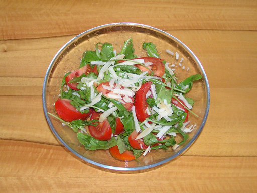 Ez a saláta adta magát, éppen akciós volt a rucola és a kecskesajt is a boltban. Úgyhogy egybekeltek és egy könnyű, ízletes és vidám színű saláta lett a végeredmény. Hozzávalók: 1 doboz (125 g) rucola saláta, 4-5 paradicsom, tengeri só, frissen őrölt fekete bors, olívaolaj, citromlé, 3 dkg reszelt kecskesajt A salátát megmossuk, lecsepegtetjük és egy nagy tálba tesszük. A megmosott paradicsomot vékony gerezdekre vágjuk. A kecskesajtot nagy lyukú reszelőn lereszeljük és a szeletelt paradicsommal együtt a salátához adjuk. Ízlés szerint sózzuk, borsozzuk, meglocsoljuk egy kis olívaolajjal és adunk hozzá pár csepp citromlevet is. Az egészet összekeverjük és frissen fogyasztjuk. Tipp: grill vagy sült húsokhoz ideális kísérő