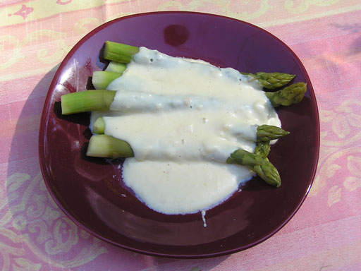 Hozzávalók: 1 tojás, 1 evőkanál finomliszt, 1-2 dl tej, 5 dkg margarin, 1 tömlős sajtkrém, 10 dkg reszelt trappista sajt, só, fehérbors, 1-2 gerezd fokhagyma, szerecsendió. A tojást felverjük és az 1 evőkanál liszttel csomómentesre keverjük, majd felöntjük a tejjel. Kis lángon felforraljuk, hozzáadjuk a margarint. Mikor forr belekeverem a sajtkrémet és reszelt sajtot és az összezúzott fokhagymát. Végül ízlés szerint teszünk bele sót, fehérborsot és szerecsendiót. Tipp: tehetünk bele füstölt sajtot, vagy egy kis fehérbort is a tej helyett. Párolt spárgára öntve a legfinomabb.