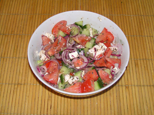 Koczekéktől kaptam kedvet az avokádókrémhez, Ők szoktak vacsorára enni gyakran. Még a magja se veszett kárba, elültettem és lett belőle szép kis növény, ami persze teremni nem fog csak 100 év múlva, de sebaj, addig is itt van nekünk az avokádó krém. Hozzávalók: 1 db avokádó, 2 tojás, 1 kis fej lila hagyma, 1 gerezd fokhagyma, 1 evőkanál tejföl, 1 kiskanál mustár, pár csepp citromlé, só, bors. Tipp: a főtt tojást tehetjük bele a végén is, amikor már összeturmixoltuk. Ízesíthetjük majonézzel is. Hozzávalók: 1 nagy fej brokkoli, 2 tojás, 1/2 pohár majonéz, 1 pohár tejföl, 1 kis fej vöröshagyma, mustár, só, fehérbors, citromlé. A brokkolit megmossuk, rózsáira szedjük és fedő alatt robbanósra pároljuk. A tojásokat keményre főzzük és tojásszeletelővel csíkokra vágjuk. A hagymát megpucoljuk, félbe vágjuk és vékony szeletekre vágjuk. A majonézt és a tejfölt összekeverjük, ízlés szerint tehetünk még bele: sót, borsot és citrom levet. Végül beletesszük a lecsepegtett brokkolit, az összevágott tojást és hagymát, jól összekeverjük. Hűtőben pár órát pihentetjük. Tipp: tehetünk még bele vékony karikára vágott füstölt virslit, sonkát vagy csíkokra vágott (füstölt)sajtot. Szeretjük a májkrémet, de sajnos a boltokban kapható májkrémek összetétele általában úgy kezdődik, víz, ... aztán valahol van benne jobb esetben 20 % máj is. Ezért lassan de biztosan átszoktunk a házi májkrémre, aminek egy baja van, hogy nagyon gyorsan elfogy. Télen mikor kevesebb a friss zöldség, sokszor eszünk fekete retket. Legtöbbször csak meghámozom és karikákra vágom, kicsit besózom és 15 perc múlva már fogyasztható is. Erős aromája és magas illóolajtartalma miatt jó köhögés és megfázásos megbetegedések ellen is, ami télen nem egy utolsó dolog. Ha valami izgalmasabbra vágyom akkor salátába teszem, úgy is isteni. Hozzávalók: 2 kisebb fekete retek, 1 nagy szál sárgarépa, 1 közepes fej lilahagyma, 1,5 dl majonéz. A retket meghámozzuk és legyaluljuk vagy gyufaszál vékonyságúra vágjuk, majd besózzuk A lilahagymát szintén meghámozzuk, félbevágjuk és vékony szeletekre vágjuk és besózzuk. A sárgarépát is meghámozzuk és legyaluljuk vagy gyufaszál vékonyságú csíkokra vágjuk. A besózott hagymát és a retket kifacsarjuk (így elveszti erős ízét) hozzáadjuk a a sárgarépát és összekeverjük a majonézzel. Hűtőben pár órát állni hagyjuk, hogy az ízek összeérjenek. Sült húsok mellé adhatjuk vagy csak magában fogyasztva is finom. Az egyik kedvenc salátám, mikor Santorinin jártunk minden nap görög salit ebédeltünk Andrissal és bevallom egy hét után se untam meg. Megfigyeltem, hogy a salátát mindig előttünk készítették el frissen. Bár a legtöbb saláta úgy az igazi, ha pár órát pihentetjük, hogy összeérjenek az ízek, a görög saláta szerintem akkor a legjobb, ha frissen készül tálalás előtt. Hozzávalók: 4 nagyobb paradicsom, 1 nagy fej lila hagyma, 1 kigyó uborka, 10 dkg fetasajt, pár szem olajbogyó, citrom, olívolaj, oregano, bazsalikom. Az uborkát és a paradicsomot vágjuk nagyobb kockákra. A lilahagymát megpucoljuk félbe és karikára vágjuk (én szét szoktam szedni a karikákat így nem csíp annyira, és a saliban is jobban elvegyül). Tipp: ez alap saláta, gazdagíthatjuk darabokra tépett salátával, vékony karikákra vágott paprikával is.