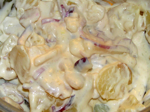 Kukoricasaláta Hozzávalók: 1 kukoricakonzerv, 2 dl tejföl, 1 kis fej vöröshagyma, 2 tojás, 1 kávéskanál mustár, só, fehérbors. A megfőtt tojásokat tojásszeletelővel felaprítjuk. A vöröshagymát apróra vágjuk. Egy tálban összekeverjük a tejfölt a mustárral beletesszük a kukoricát, az apróra vágott hagymát és tojásokat majd végül sózzuk, borsozzuk. Pár órára hűtőbe tesszük, hogy összeérjenek az ízek. Tipp: gazdagíthatjuk a salátá apróra vágott almával, uborkával, sajttal is. 60 dkg kifli krumpli, 1 nagy fej lilahagyma, 2 teáskanál só, 2 dl olaj, 2 tojássárgája, 1 kávéskanál porcukor, pár csepp citromlé, őrölt fehér bors, 1 kávéskanál mustár, 2 dl tejföl. A krumplikat megmossuk, majd héjában sós vízben megfőzzük. Míg a krumpli fő, addig elkészítjük a majonézt. Tipp: lilahagyma helyett tehetünk bele póréhagymát is. Megszórhatjuk apróra vágott petrezselyemzölddel is. Anno egy KEK-es bulin Judit barátnőm ismertette meg velem a padlizsánt, de túl macerásnak találtam az elkészítését, és az íze se volt megnyerő. Aztán pár éve Lilla barátnőmékkel kóstoltunk egy vendégházban hasonlót, de itt se voltam kibékülve az elkészítés idejével. Hozzávalók: 1 nagyobb padlizsán, 1 nagyobb fej vöröshagyma, 2 dl tejföl, mustár, só, fokhagyma, pirospaprika, citrom, olaj. Az olajon üvegesre pároljuk az apróra vágott hagymát, majd hozzáadjuk a meghámozott és apró kockákra vágott padlizsánt, sózzuk, borsozzuk. Egy kis pirospaprikát is tehetünk bele (hogy szebb színe legyen a krémnek). Fedő alatt pár perc alatt puhára pároljuk., közben néha megkeverjük, nehogy odaégjen. Ha kész turmixgépbe öntjük, hozzáadjuk a tejfölt, ízlés szerint mustárt, citromlevet és összeturmixoljuk. Pirítóssal tálaljuk vagy ahogy én szeretem; mártogathatunk bele sárgarépát, uborka darabokat, újhagymát. Tipp: tejföl helyett tehetünk bele majonézt is, úgy krémesebb lesz.