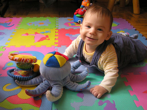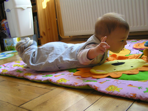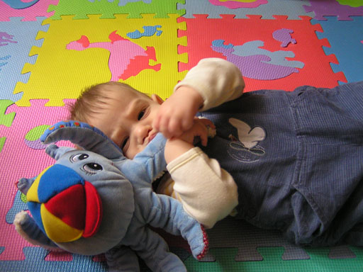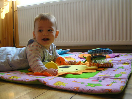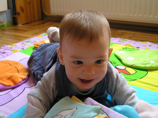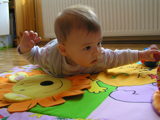 Úgy éreztem itt az idő, hogy teret adjak Levinek, hogy ne csak a kiságyban és a kanapén mozogjon. Előszedtem az Egértől kapott bejáratott habtapikat, és alapos lemosás után összerakva átadtam Levinek az új játszóterét. Az első percekben a sok színes forma teljesen lekötötte, majd eljött az igazi tesztelés, a jól megszokott repülőzés. Ahogy elnézem teljesen mindegy mekkora területre teszem le a habtapit, valahogy mindig addig izeg-mozog vagy forog hogy már lelóg a lába a parkettára vagy érdeklődve tapogatja a kezével a habtapi szélét. Megfordulni nem nagyon akar, az oldalára is ritkán fordul, inkább forog a tengelye körül vagy hátrafelé tolat és amint hasra kerül repülőzik fáradhatatlanul.