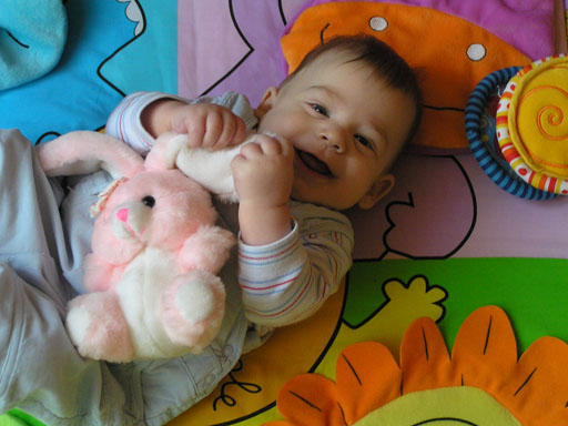 Sokat fejlődött a kézügyessége is, most már biztos kézzel fogja meg a dolgokat. Egyik kezéből átteszi a másikba vagy mindkét kezével nyúl a játékokért, ütögeti őket és örömében emelgeti a lábait. Nem lehet már csak úgy egyedül hagyni, képes teljesen keresztbe fordulni a kiságyban is vagy ott ahova letettük. Rájött, hogy a gerince hajlékony és hogy tudja így tekergetni a testét is, ennek örömére hatalmas homorításokra képes, sőt a kezünkben is nyeklik-nyaklik ha éppen nincs kedve tartani magát.